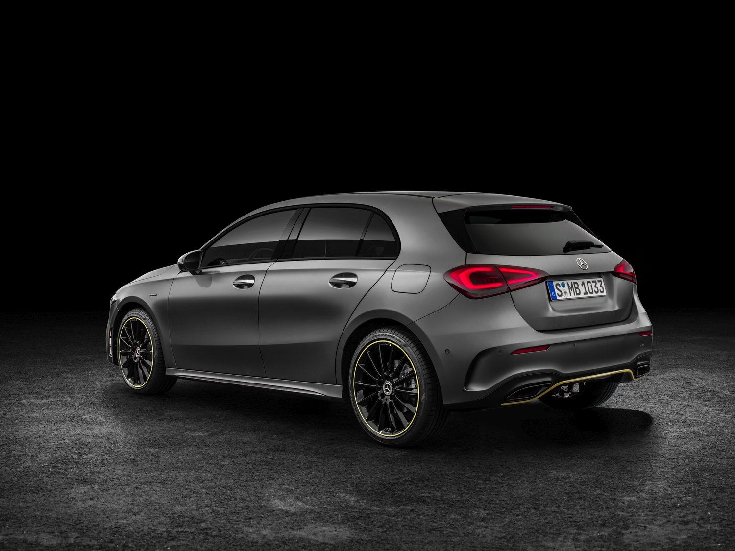 kerekeket körbeölelő, megnövelt méretű kerékjárati ívek tovább fokozzák az új A-osztály sportosságát. A hátsó traktus optikailag szintén szélesebb hatást kelt, amiben fontos szerepük van a széles vállaknak, valamint a moduláris felépítésű, kétrészes hátsó lökhárítónak. A keskeny, két részre osztott hátsó lámpatestek hátulnézetből is egyediek.Mindössze 0,25-ös cw-értékével (légellenállási együtthatójával) és 2,19 négyzetméteres homlokfelületével (A) az új A-osztály aerodinamikai fronton is a kategória éllovasa. A kompakt szegmensben elsőként az A-osztály kínálja opcionálisan a kétrészes AIRPANEL-t. A hűtőrács mögött elhelyezkedő zsalurendszer a hűtési teljesítményigény függvényében nyitja ki az állítható lamellákat. A rendszámtábla alatt egy második zsalurendszer helyezkedik el, amely tovább fokozza a rendszer teljesítményét.