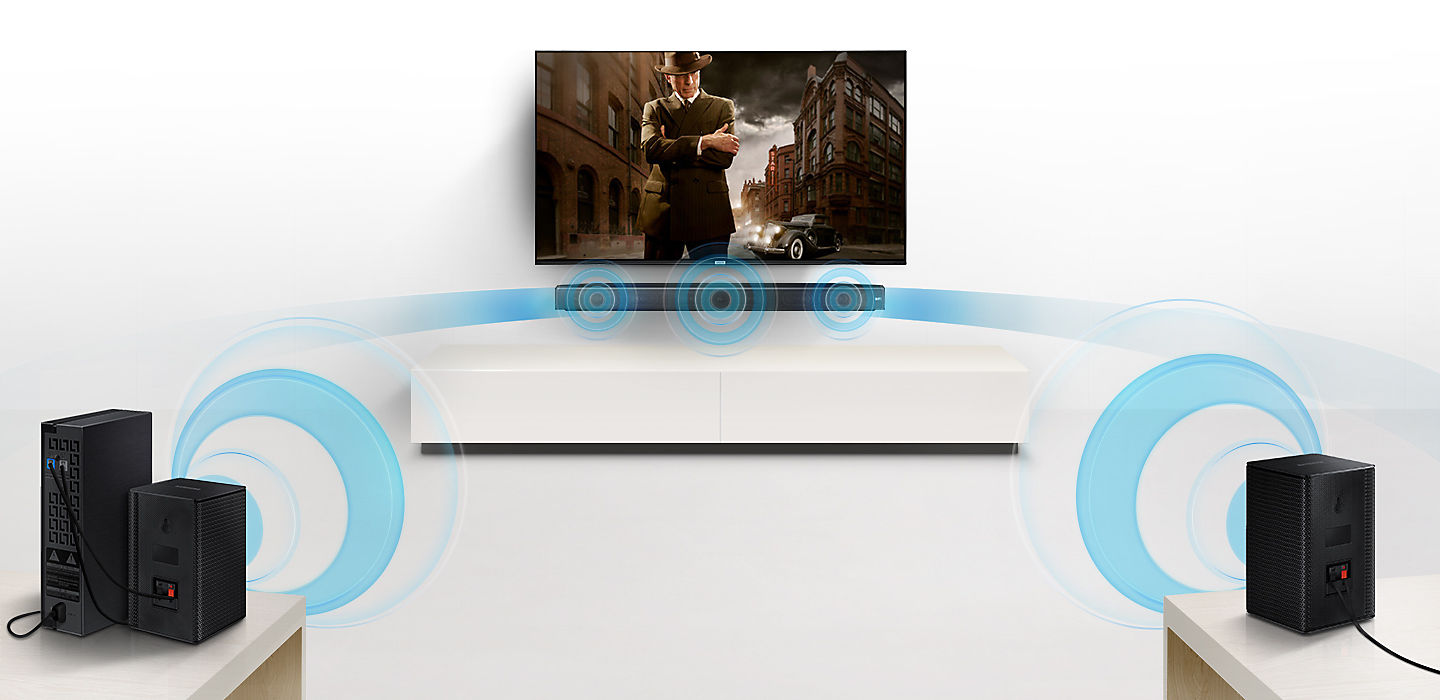 Az egyedi design, és az egybeépített hangfalak (helyén kezelve a rendszert) összességében jól teljesítenek. Azonban hang esetében meg kell említenünk, hogy ez a rendszer nem egyenértékű a fizikálisan minden sarokban elhelyezett komplett 5.1házimozi rendszerekkel. Persze egy ilyen rendszerrel a Samsungnak nem is ez volt a célja, hanem az, hogy a TV saját hangzását feljavítsa, úgy, hogy ez minimális összeköttetéssel, a legkevesebb vezetékeléssel járjon.