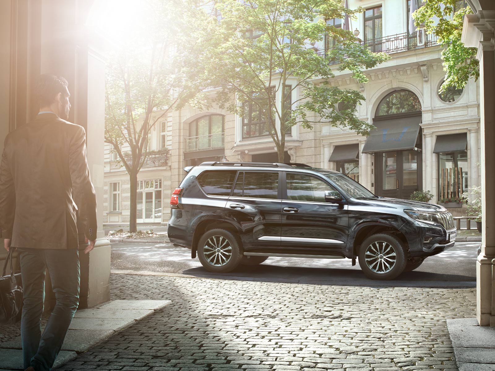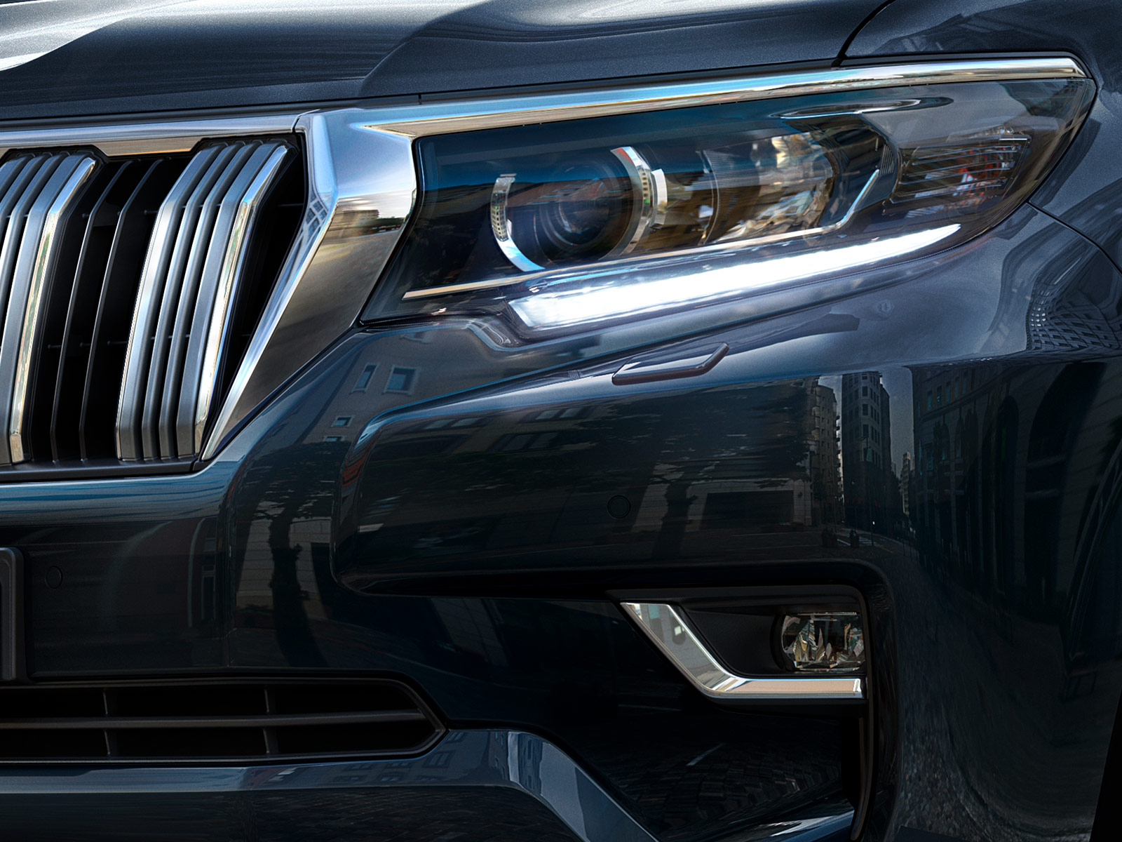 DRL jár.A Land Cruiser széles, erőteljes kiállását még inkább kihangsúlyozza az orr-rész alsó traktusának éles lemetszése, ami hatásosan javítja az autó első terepszögét. A legkisebb hasmagasság 215 mm (a háromajtós modell esetében 205 mm), így az első terepszög 31, a hátsó terepszög 25, a rámpaszög pedig 22 fokos. Oldalnézetből feltűnik, hogy az első lökhárító felső csúcsa magasabbra került, és hogy a motorháztető, a sárvédő, az első és hátsó lökhárító ugyanazon a képzeletbeli vízszintes vonalon húzódik; ez a megoldás atlétikusabb és dinamikusabb benyomást kelt. Ezt a hatást tovább erősítik a hatküllős, 17