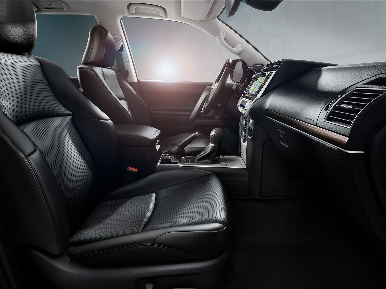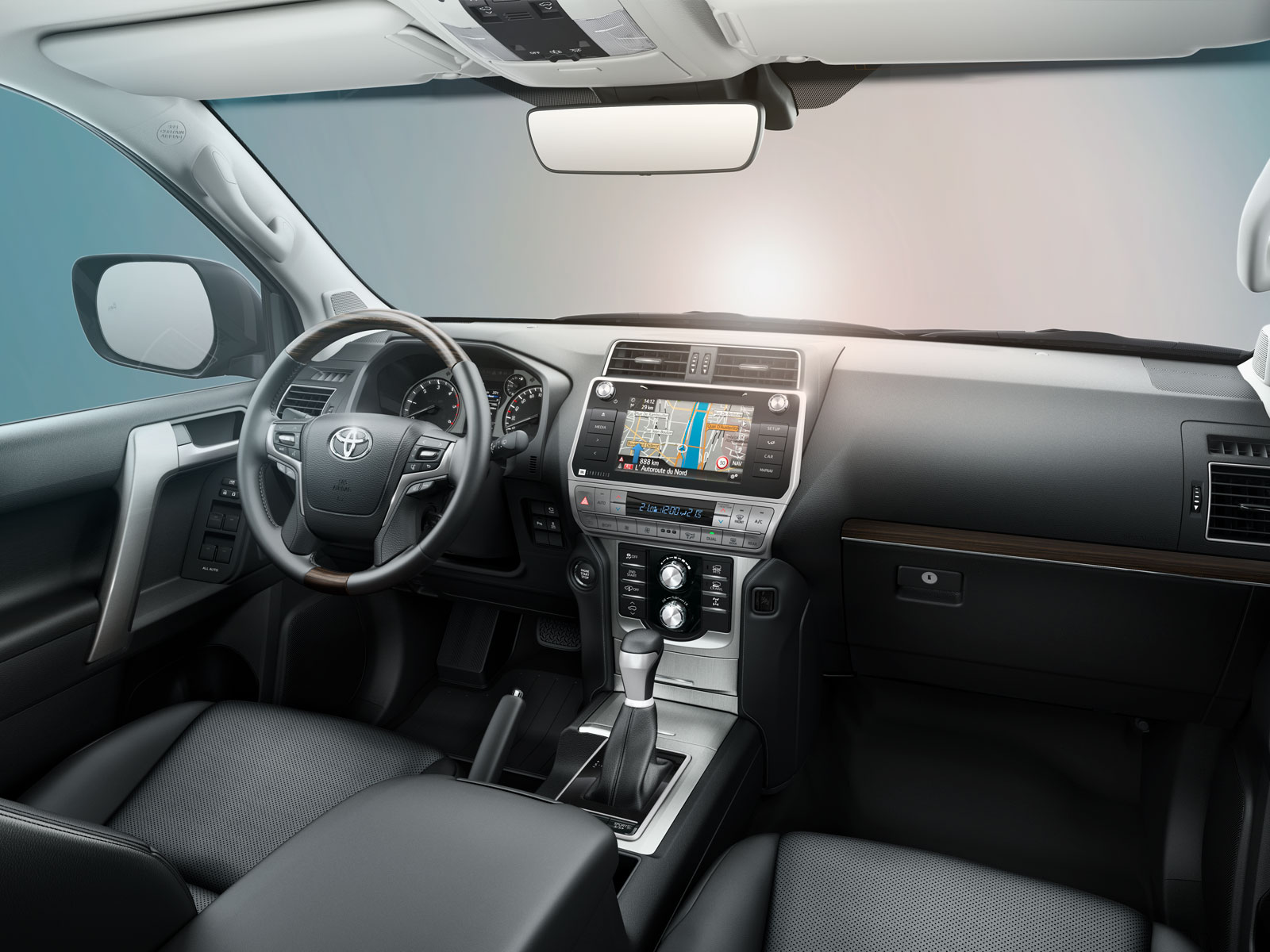multi-információs kijelzőt fognak közre, amely átfogó információkat ad a vezetőnek az autóról és a szórakoztató rendszerről. A kormánykerék kapcsolóival kezelhető kijelzőn jelennek meg a vezetés, a jármű, a navigáció, az audio és a vezetősegítő rendszerek információi, valamint a figyelmeztető üzenetek. Maga a kormánykerék is megújult; az új volán olyan, mint a Land Cruiser V8 modelleké. Az utastér luxusát és kifinomultságát magasabb szintre emeli a műszeregység, a középkonzol és az ajtón elhelyezett kapcsolók új, fehér színű háttérvilágítása. A kabin belső világítása megújult: LED diódák kerültek első lábtérbe, a tetőkárpitba és a kesztyűtartóba, sőt az ajtópanelekbe is. Az új Land Cruiser utasterébe háromféle (Fekete, Barna/Fekete és Prémium Bézs) színösszeállítást kérhetnek a vásárlók. A kárpitkínálatot prémium minőségű díszítőelemek egészítik ki: a középkonzol Hajszálrepedéses Ezüst felületkidolgozásához jól illik az újonnan kifejlesztett Világosbarna vagy Sötétbarna fabetét.Toyota Touch® 2 with Go