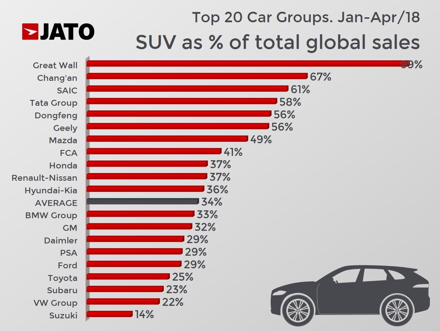 A mértékadó JATO legutóbbi elemzéseiből kiderül, hogy a SUV-ok szárnyalása világszerte épp olyan megállíthatatlan, mint Európában vagy épp Magyarországon. Külön izgalmas, hogy vannak olyan autógyártók, amelyek mindent egy lapra tesznek fel, amiben három kínai vállalat jár az élen: a Great Wall összesített eladásainak 99%-át, a Chang’an értékesítéseinek 67%-át, míg a SAIC eladásainak 61%-át teszik ki a SUV-ok. A maga 58%-ával nincs sokkal lemaradva tőlük az indiai Tata Group, és 56-56%-al a szintén kínai Dongfeng és Geely sem. Érdekes ugyanakkor, hogy a SUV-mánia talán legnagyobb nyertese világszinten és Európában illetve Magyarországon is a Lexus prémium márkát is jegyző Toyota, amelynek világszintű eladásaiból mindössze 25%-ot tesznek ki a SUV-ok. Ennek egyik oka, hogy a Toyota összességében minimum ötször több autót értékesít világszerte, mint az egyes említett versenytársak, a másik pedig az, hogy a Toyota a RAV4 révén nem csupán a SUV szegmenst teremtette meg, de a Lexus RX révén a japán vállalat mutatta be az első környezetbarát hibrid elektromos SUV-ot, is amelyből azóta már egészen széles portfóliót kínál, így egyszerre részesedik a SUV-ok és a zöld autók iránti sosem látott kereslet jelentette előnyökből.