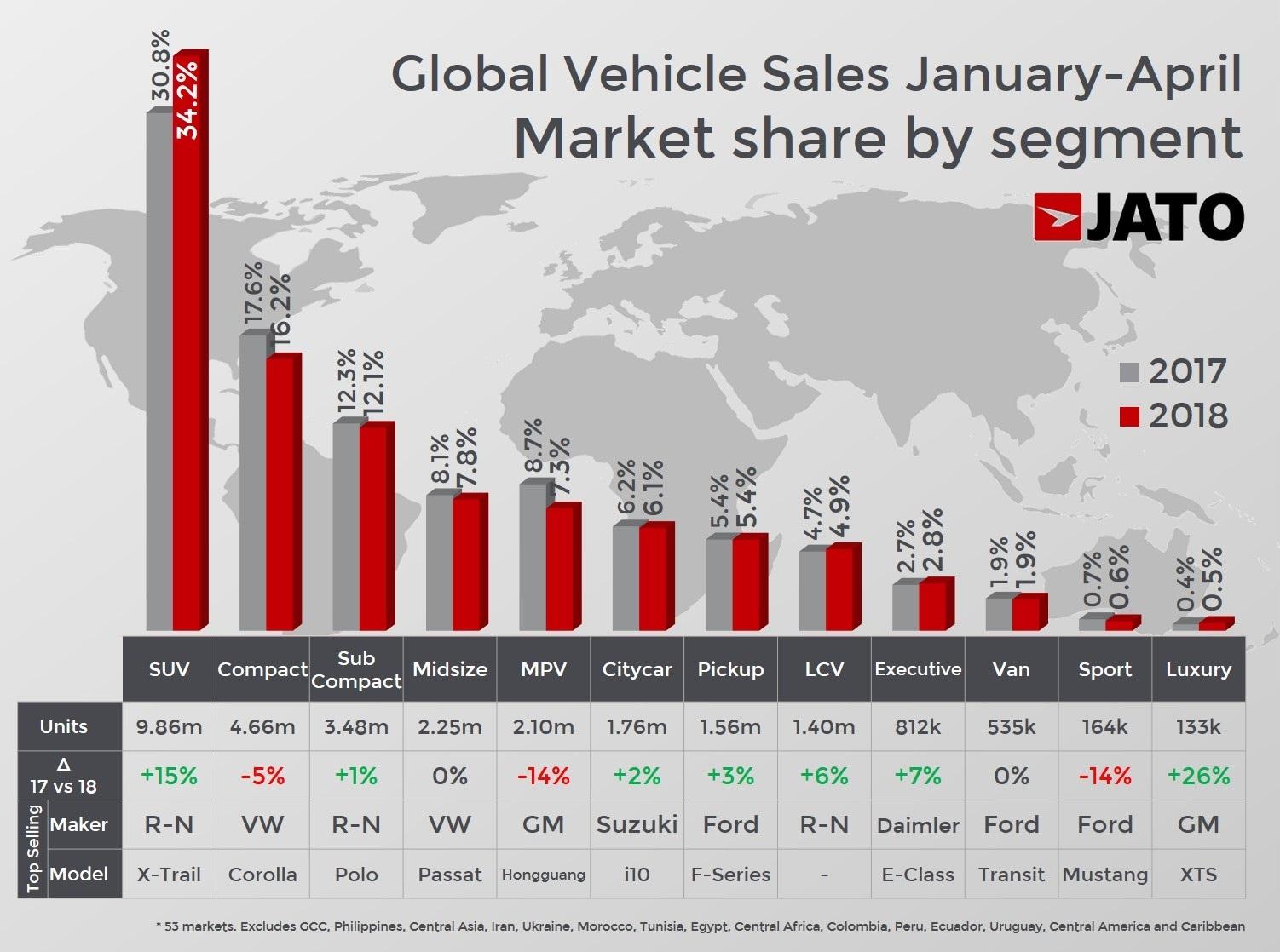„A korábban látott, folyamatos növekedés időszaka változásokat eredményezett a piac összetételében. A SUV-szegmens azért növekedett, mert a megszokott típusok egyedüli alternatívájaként szolgált. A SUV-szegmens jelentősége evidens, ha a legfrissebb modellbevezetéseket nézzük: a most piacra dobott autók közel kétharmada SUV, ami azt jelenti, hogy mind a piaci kínálat, mind a fogyasztói kereslet ezekre az autókra koncentrálódik, és vélhetően, ahogy a szegmens dominanciája nő, az autógyártók egyre több ilyen modellt hoznak majd ki. Ez a folyamat, illetve a dízelüzemű modellek visszaszorulása azt eredményezi, hogy módosul az autópiac összetétele. Ez azt jelenti, hogy a piac stabilizálódásával a jövőben már nem várhatunk a korábbi évekhez hasonló hatalmas növekedést. Érdekes lesz látni, miként alakul a trend, és hogyan alkalmazkodnak az autógyártók a megváltozott viszonyokhoz.” – fogalmaz Felipe Munoz a JATO globális elemzője.