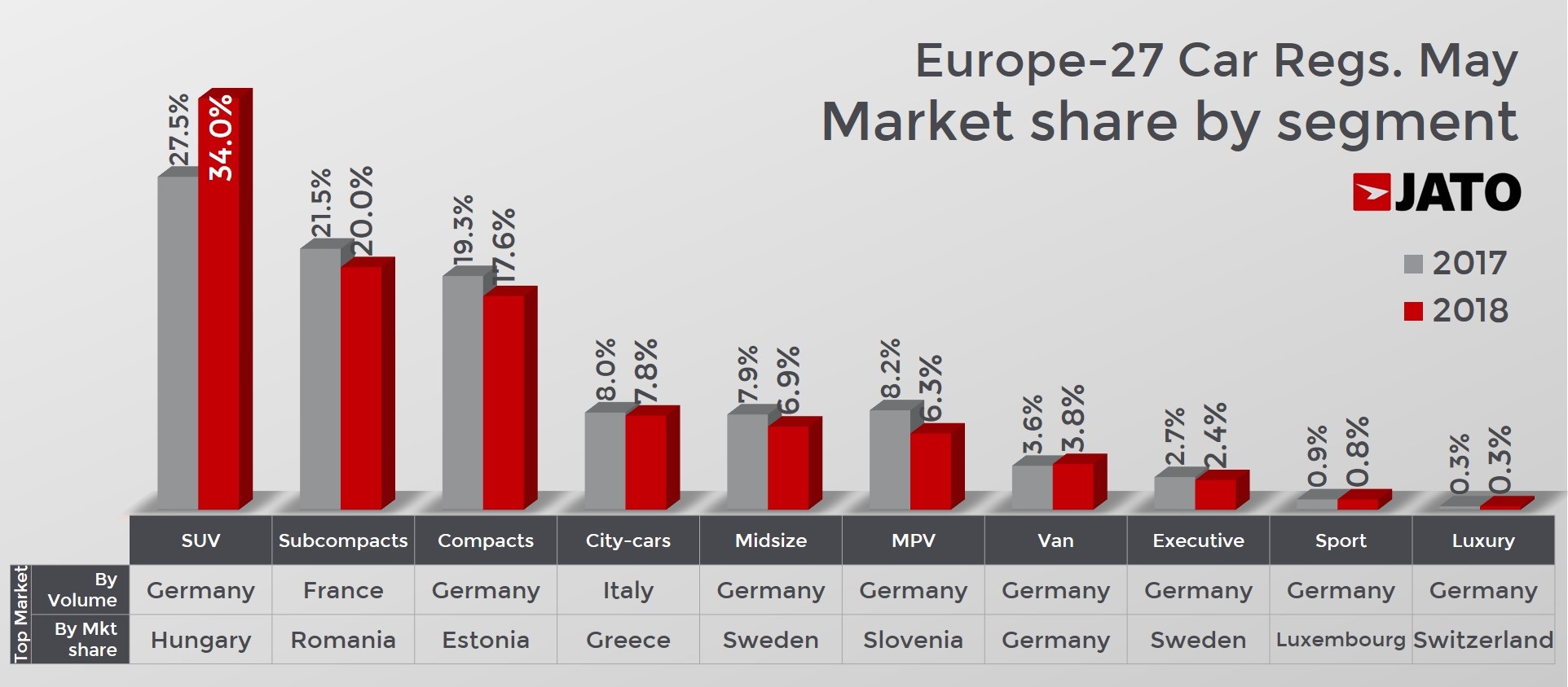Májusban egyébiránt a legnagyobb növekedést az összesen 182.000 darabos értékesítést előre kisméretű SUV-ok produkálták Európában, amit valamivel lassab de még így is látványos bővüléssel 208600 darabot elérő a kompakt SUV-ok követtek. A piac legszélesebb környezetbarát hibrid elektromos modellportfólióját kínáló Toyota és Lexus piaci pozícióit erősíti a dízel eladások folyamatos zuhanása is, legtöbb versenytársuk ugyanis még korlátozott kínálattal rendelkezik az alternatív hajtású SUV-ok terén, így a zöld hajtásláncok sosem látott népszerűsége és a SUV-ok szárnyalása organikus módon nem várt magasságokba emelheti a környezetbarát autózás szinonimájának tekintett két japán márkát Európában is.
