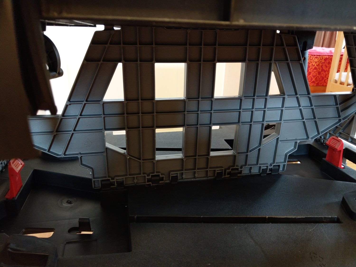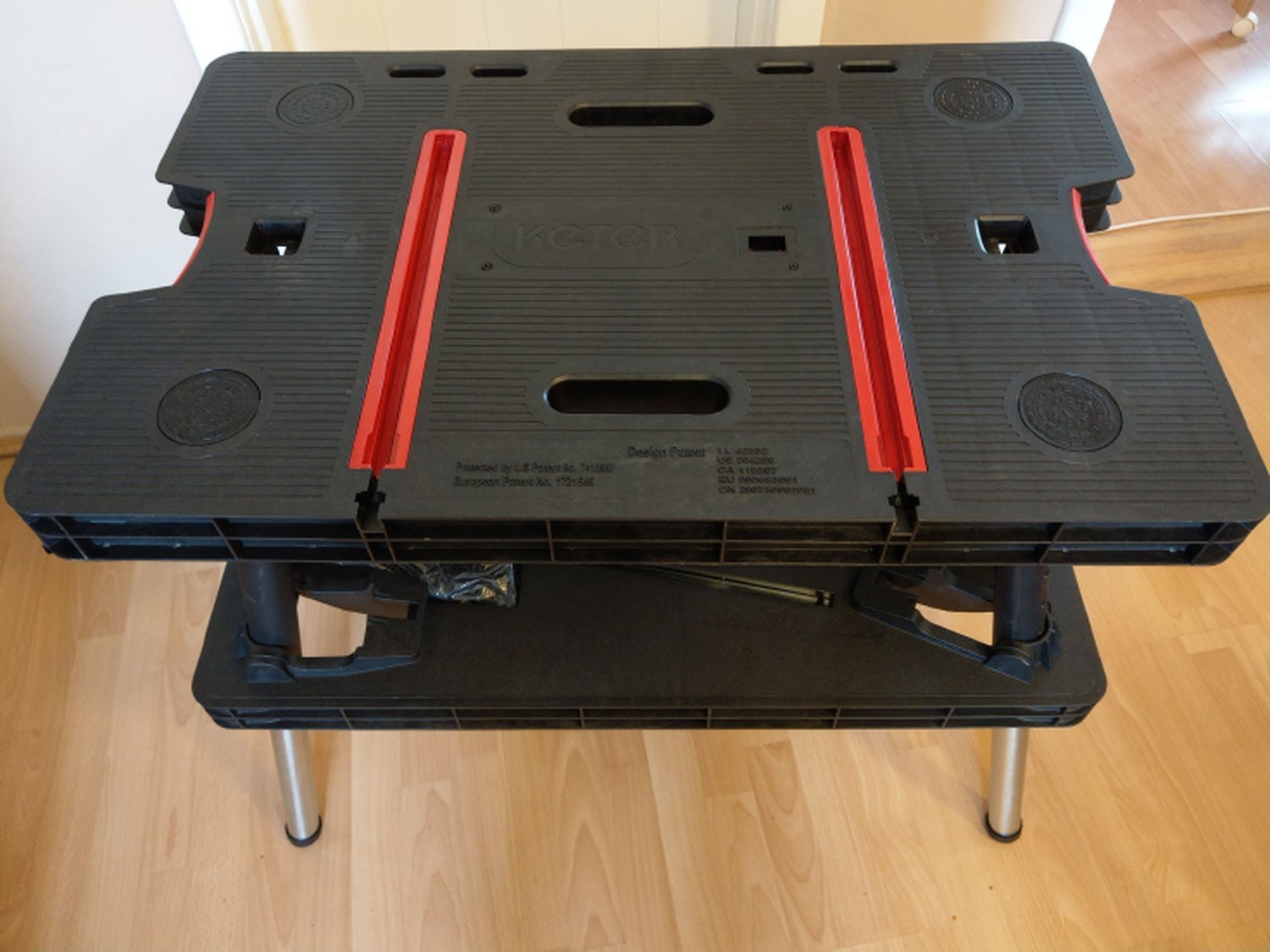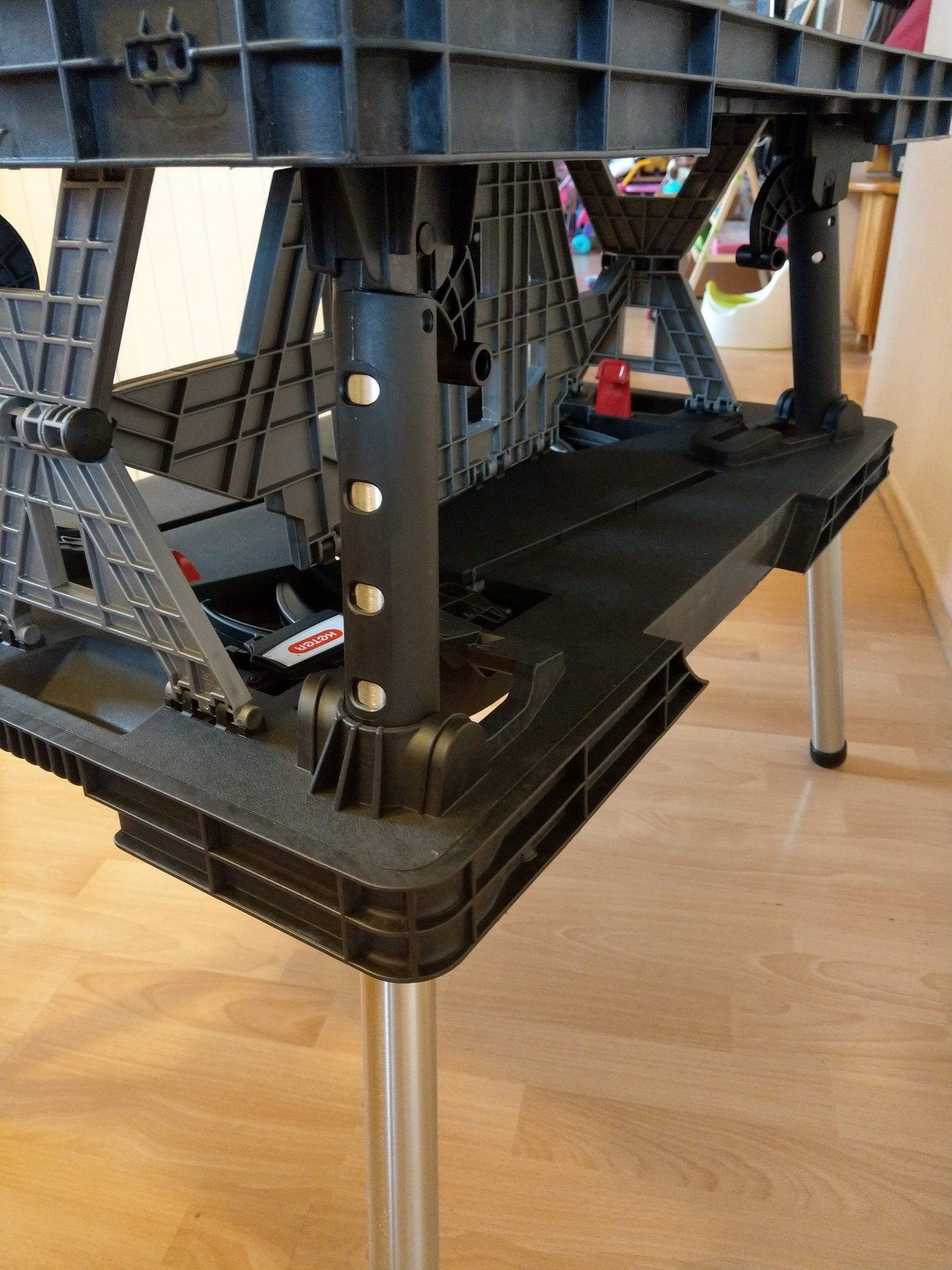 Szétnyitva és összeállítva, már határozottan egy formás, stabil munkaasztalra asszociálunk. Apropó, az összeállítás tényleg gyerekjáték. Nagyon egyszerűen előkertül a 4 kihajtható láb, és ez után már csak az asztallap alatt lévő merevítő lapot kell a helyére illeszteni és bepattintani, és már stabilan áll is a munkaasztalunk. A gyerekjátékot egyébként azért is írtam, mert a két kislányom is örömmel segített az asztal lábra állításában. Melyet a galériában található fotók is alátámasztanak.