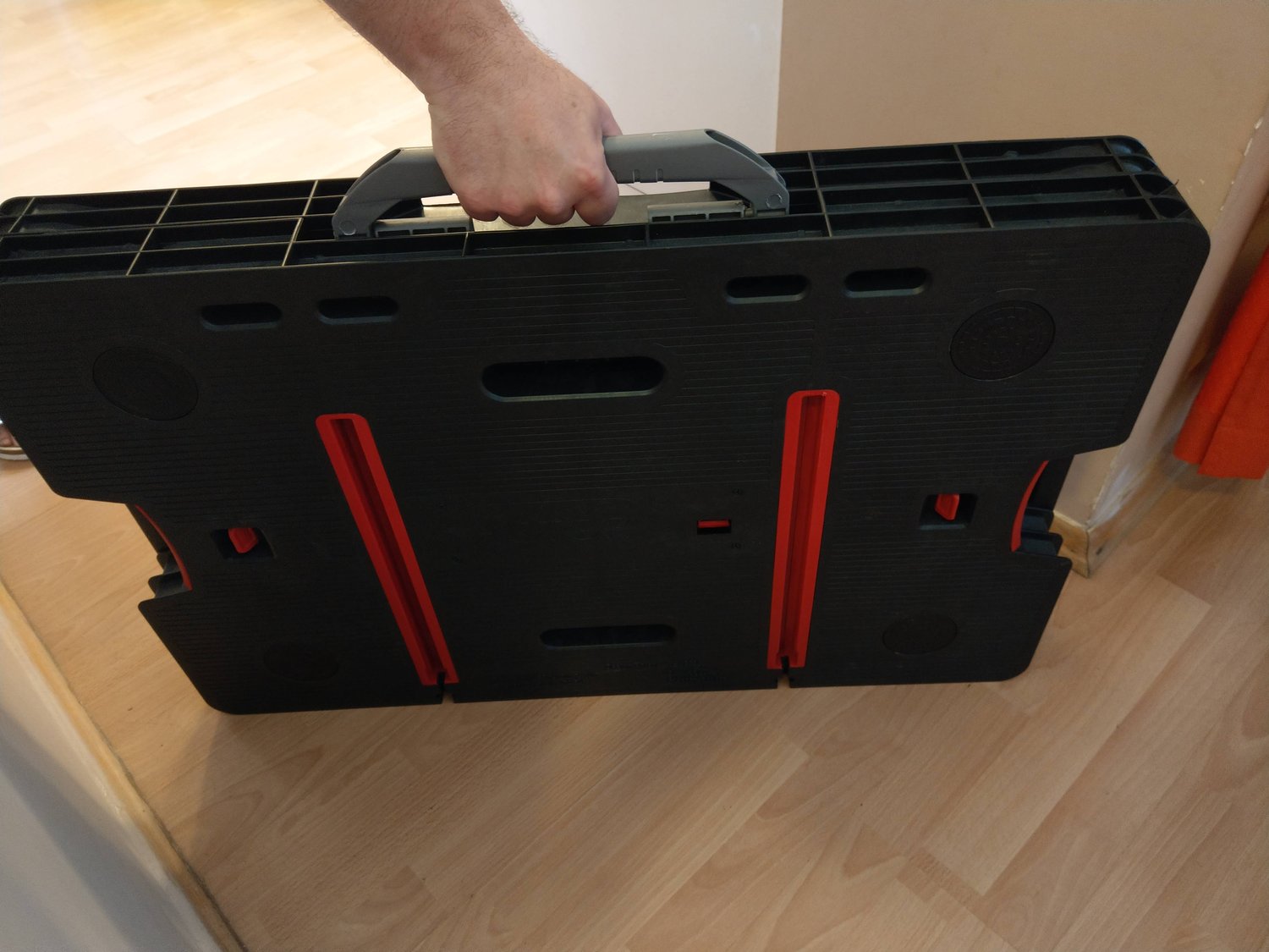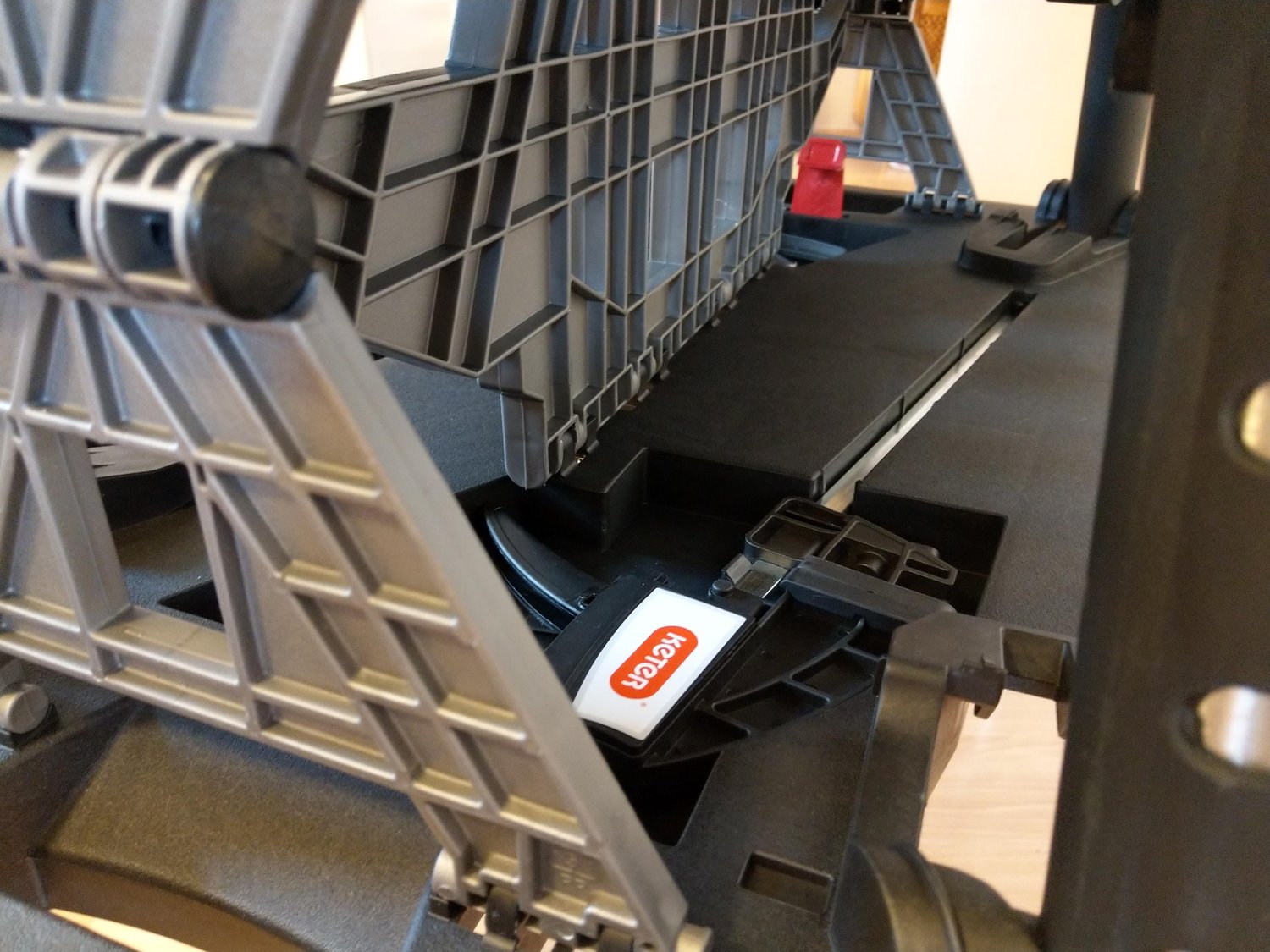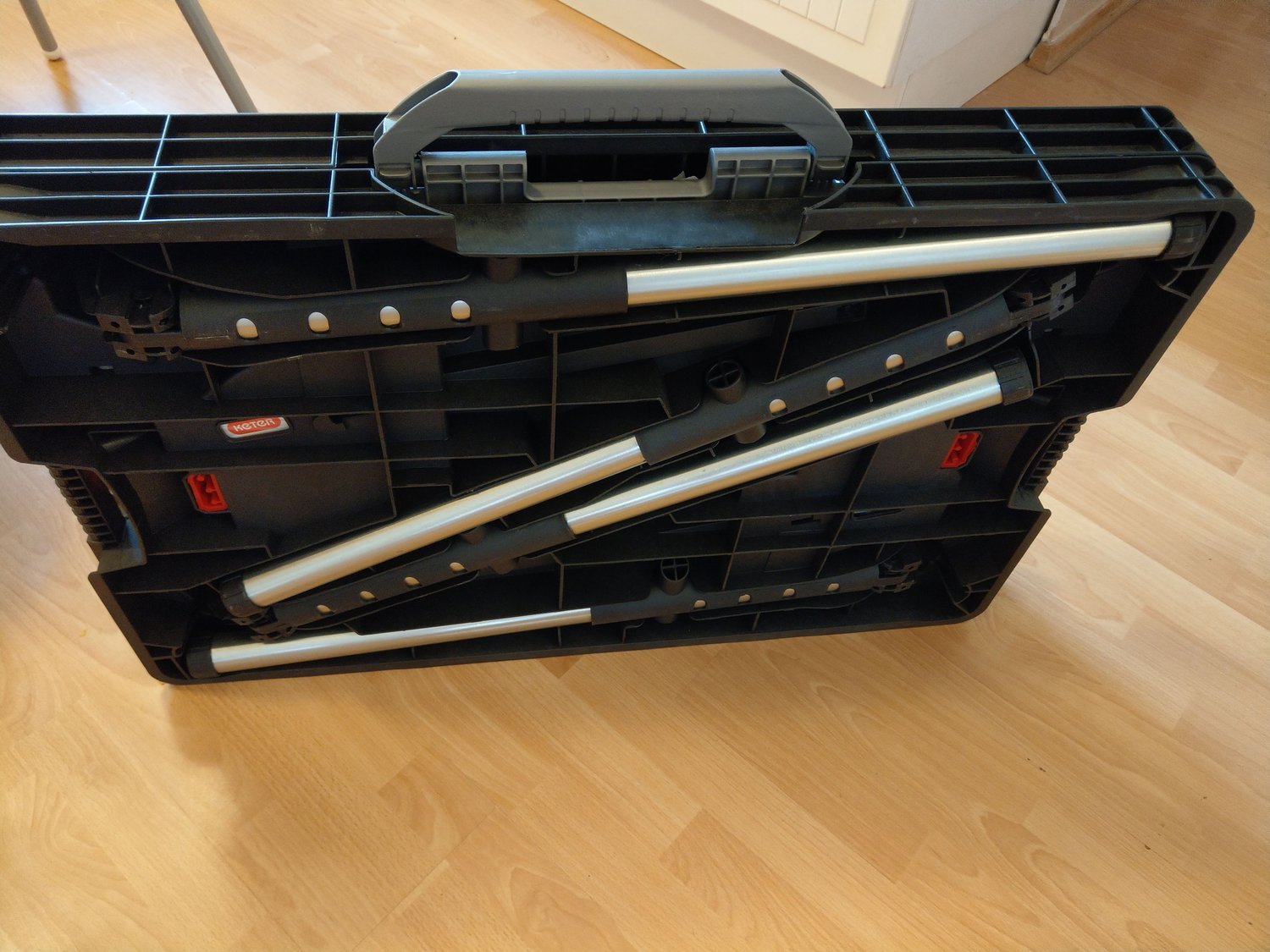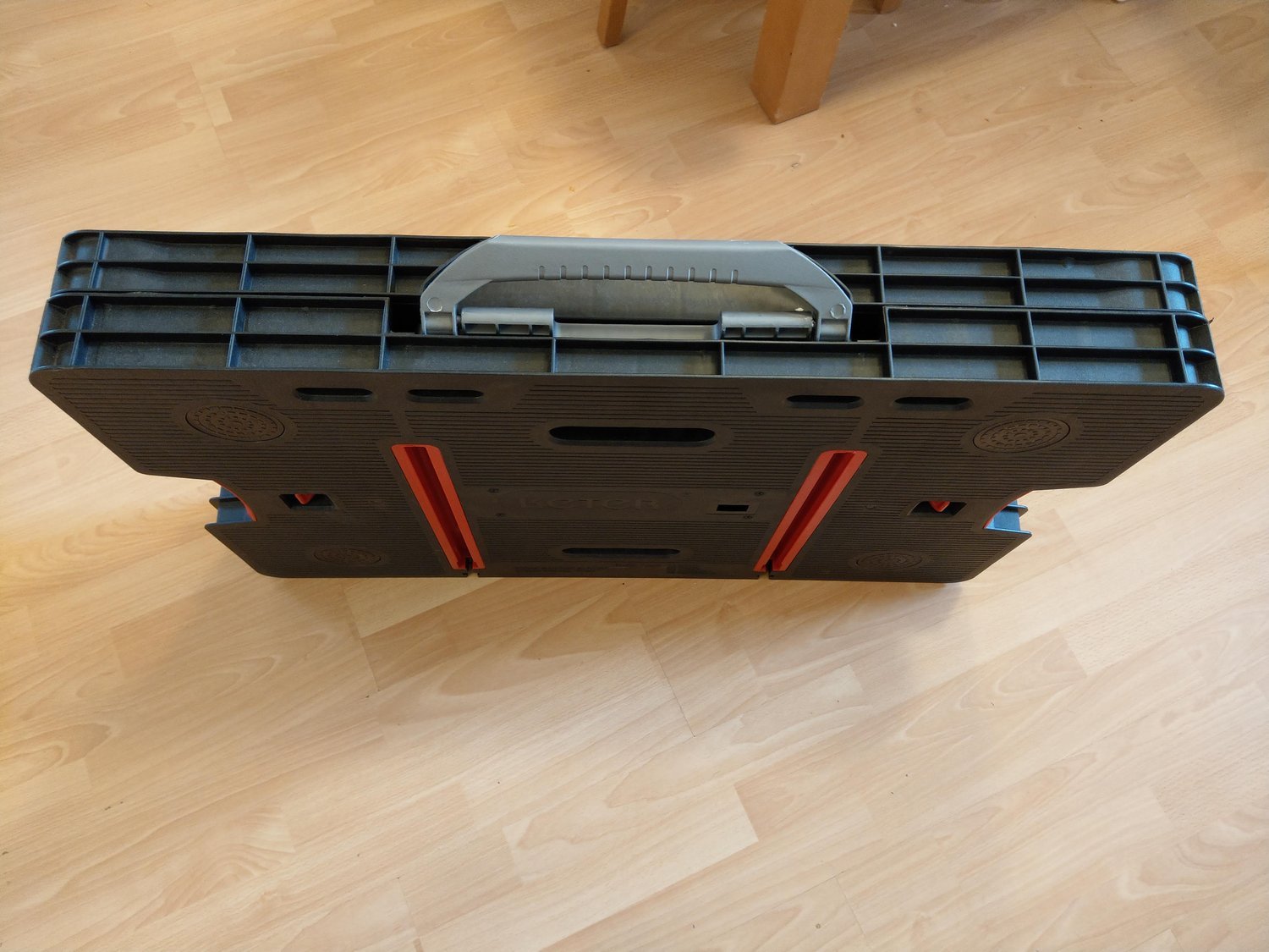 A gondosan becsomagolt KETER munkaasztalt futár hozta. A külső műanyag csomagolóanyag lebontása után farkasszemet nézhettünk a termékkel. Összecsukott állapotban 856 x 565 x 115 mm. Egy túlságosan nagyra nőtt műanyag aktatáskára emlékeztet, mert vihetjük úgyis a fülénél fogva, mint egy táskát.