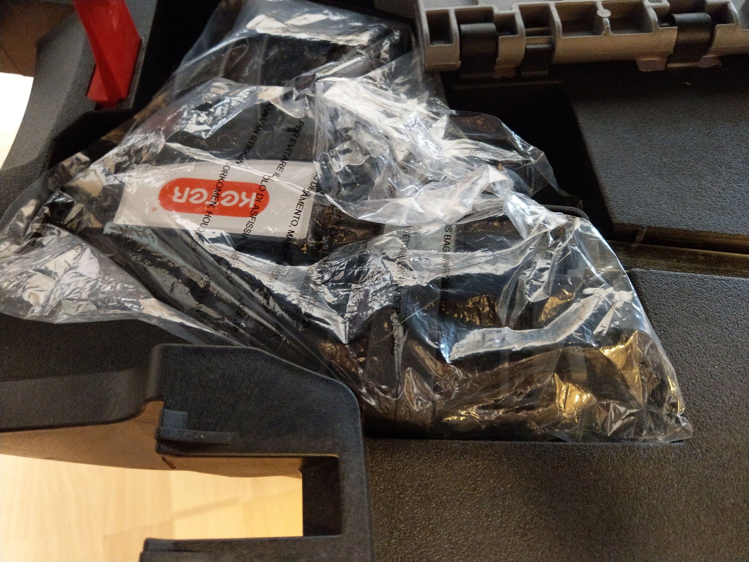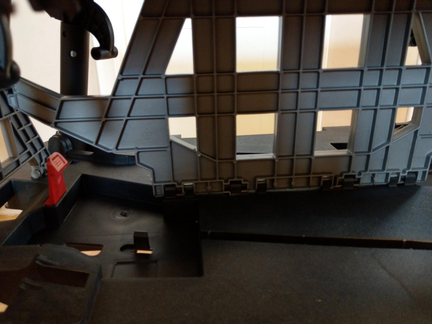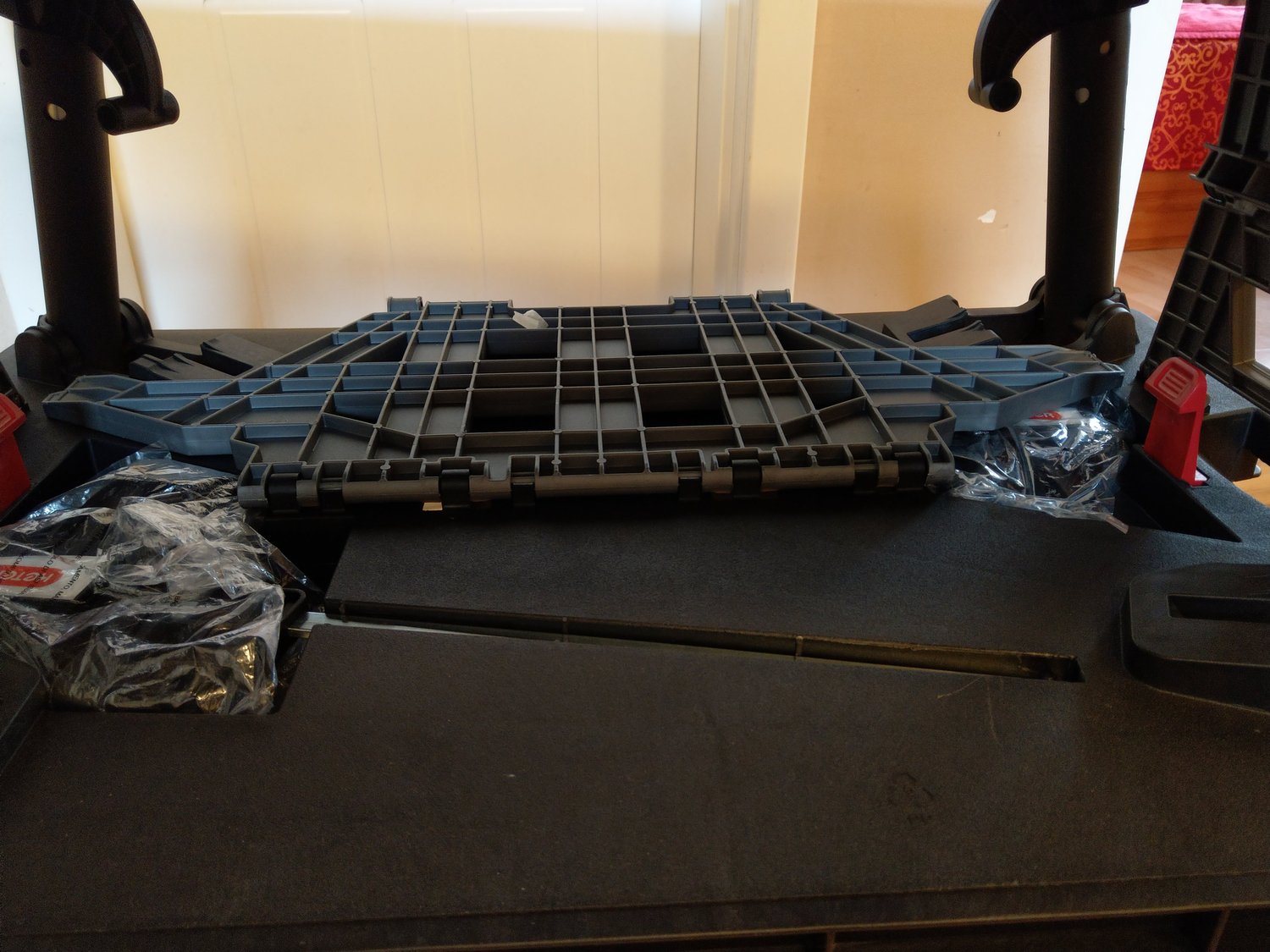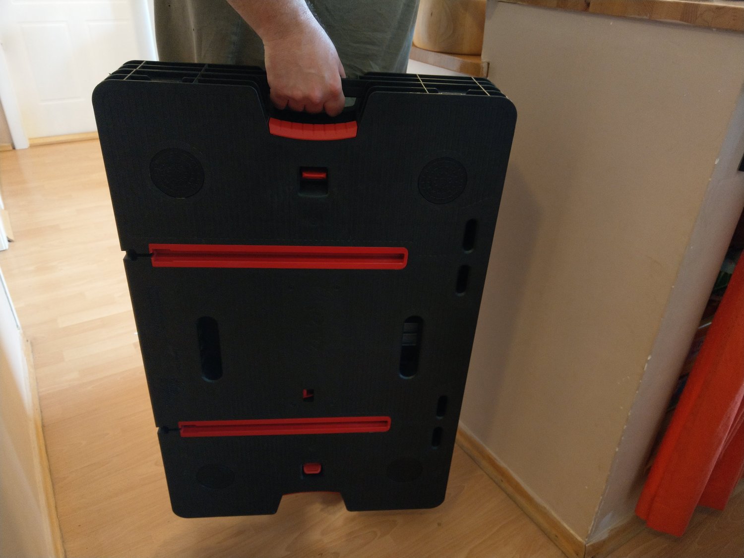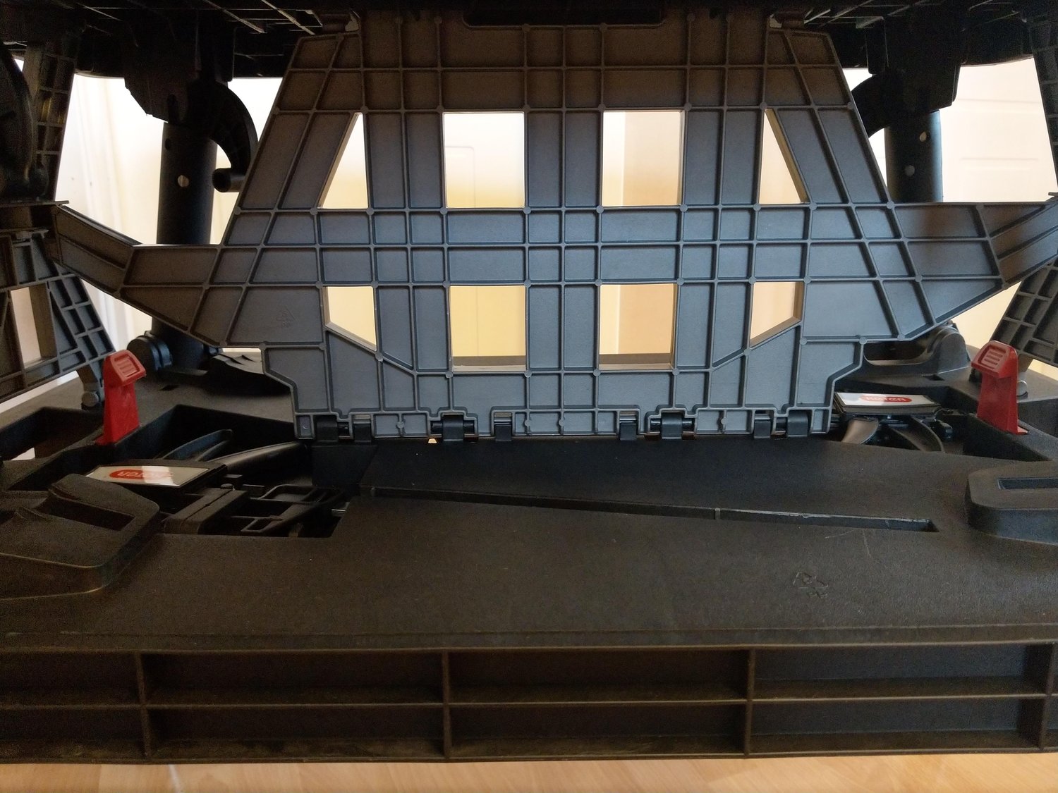 A gondosan becsomagolt KETER munkaasztalt futár hozta. A külső műanyag csomagolóanyag lebontása után farkasszemet nézhettünk a termékkel. Összecsukott állapotban 856 x 565 x 115 mm. Egy túlságosan nagyra nőtt műanyag aktatáskára emlékeztet, mert vihetjük úgyis a fülénél fogva, mint egy táskát.