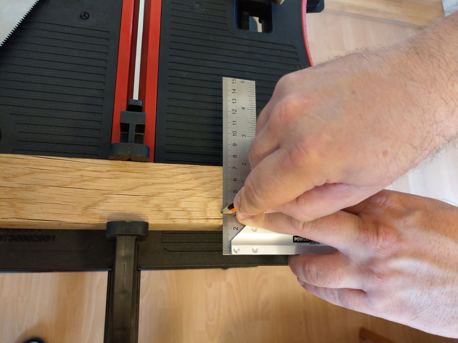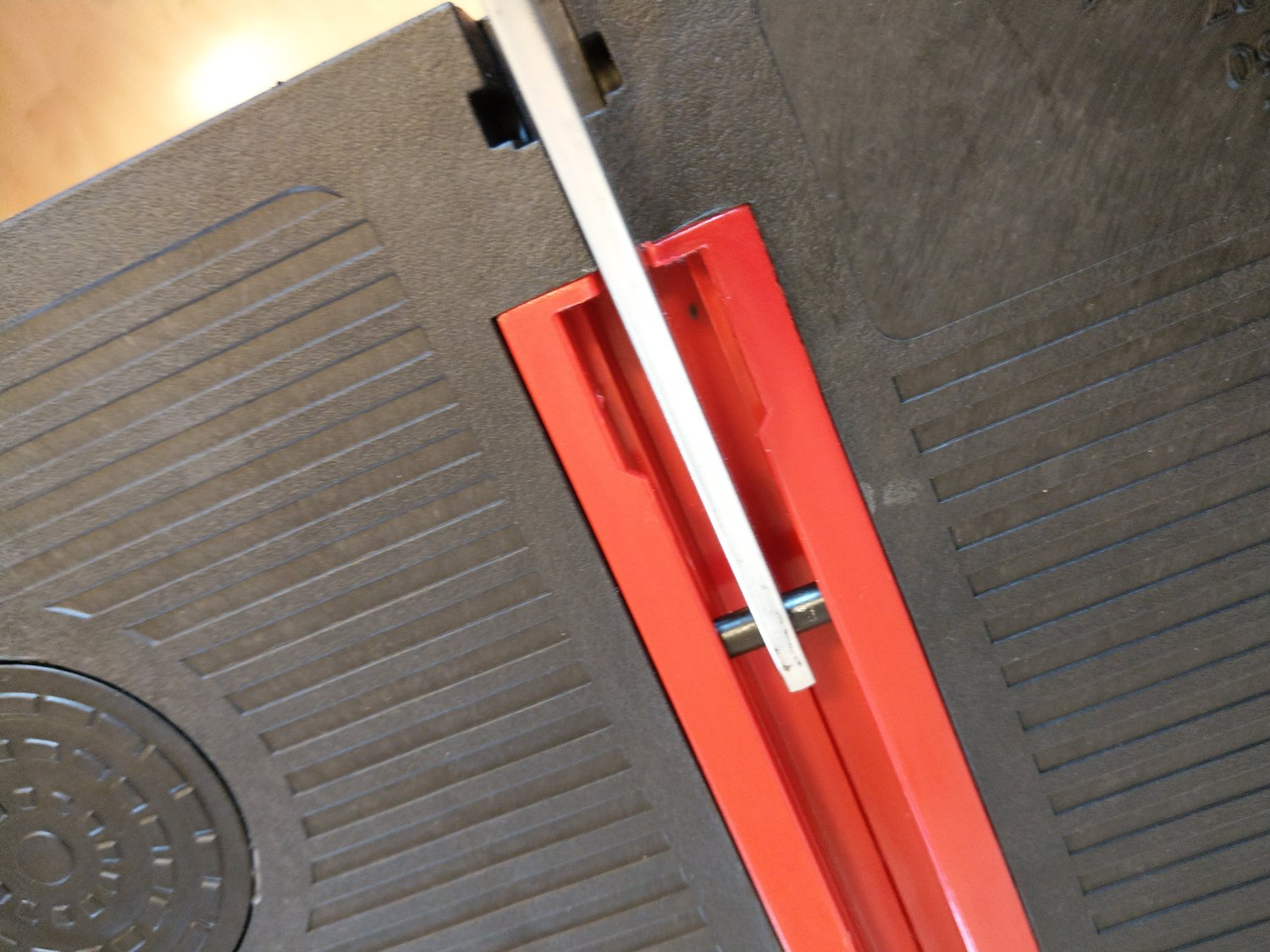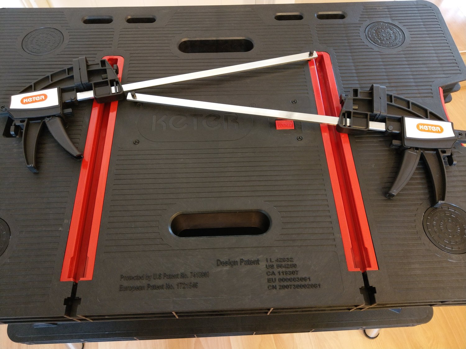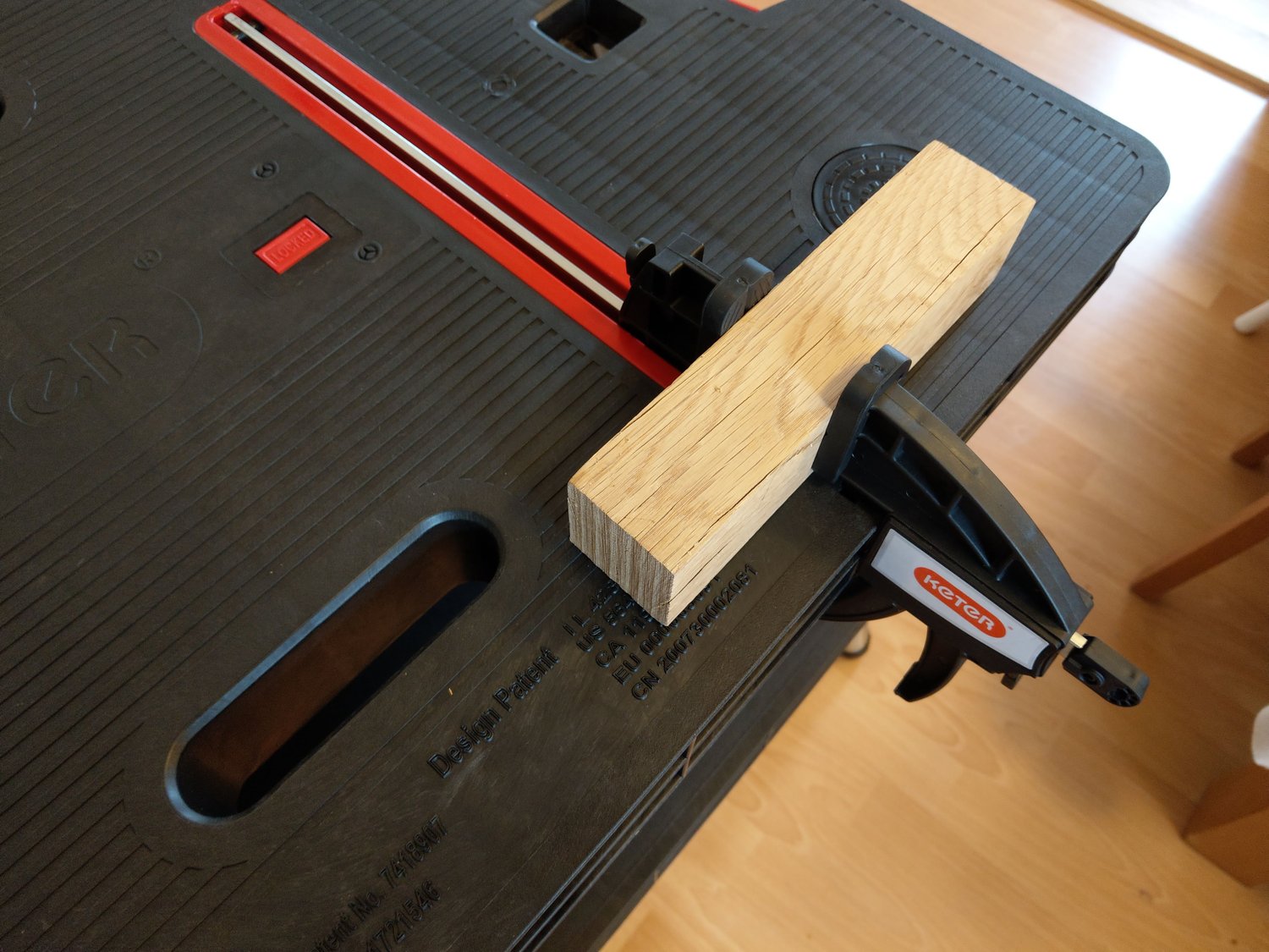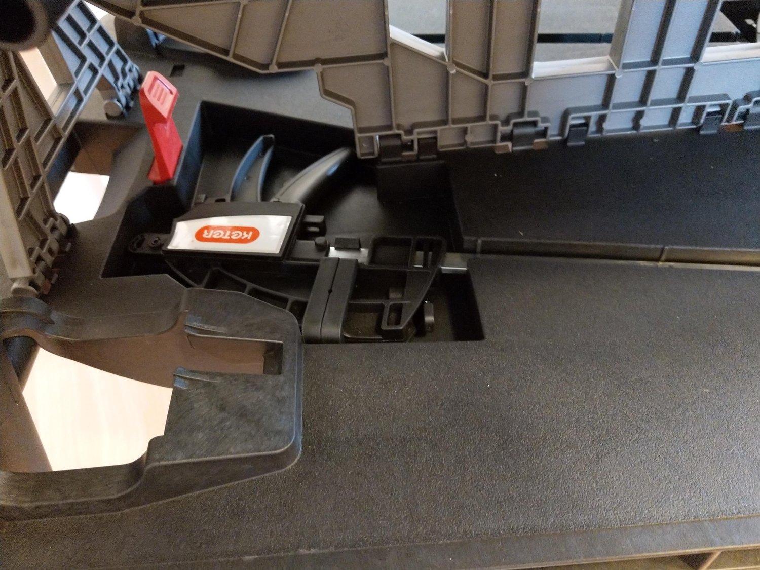 Összeállítva előkerül a két darab tartozékként hozzájáró szorító is. Ezeket egyébként többféleként is használhatjuk: alapból adja magát, hogy a pirossal megjelölt vájatba beillesszük. Így pl. egy akár 30 centis faanyagot is az asztallaphoz szoríthatunk a megmunkálás, vagy fűrészelés végett. A másik lehetőség, pedig, ha nem a gyári vájatba, hanem egyszerűen csak magához az asztallaphoz szorítjuk az anyagot. A rögzítés módját nyilván az elvégzendő munka, ill. az anyag mérete határozza meg.