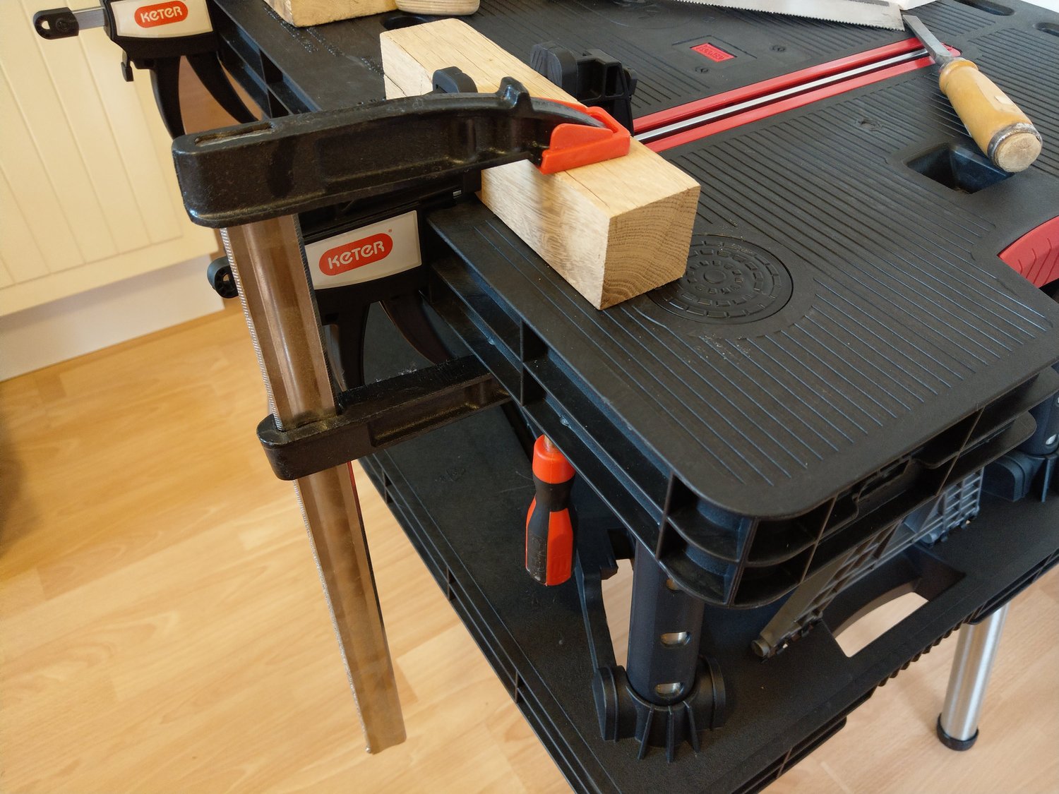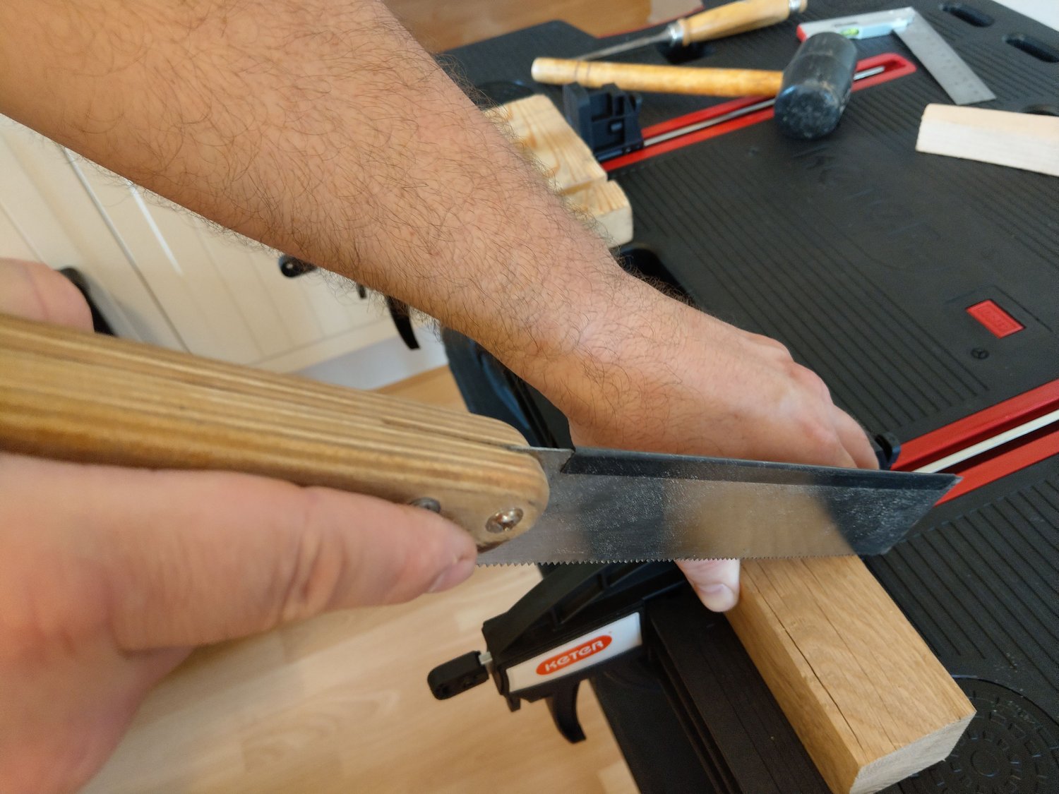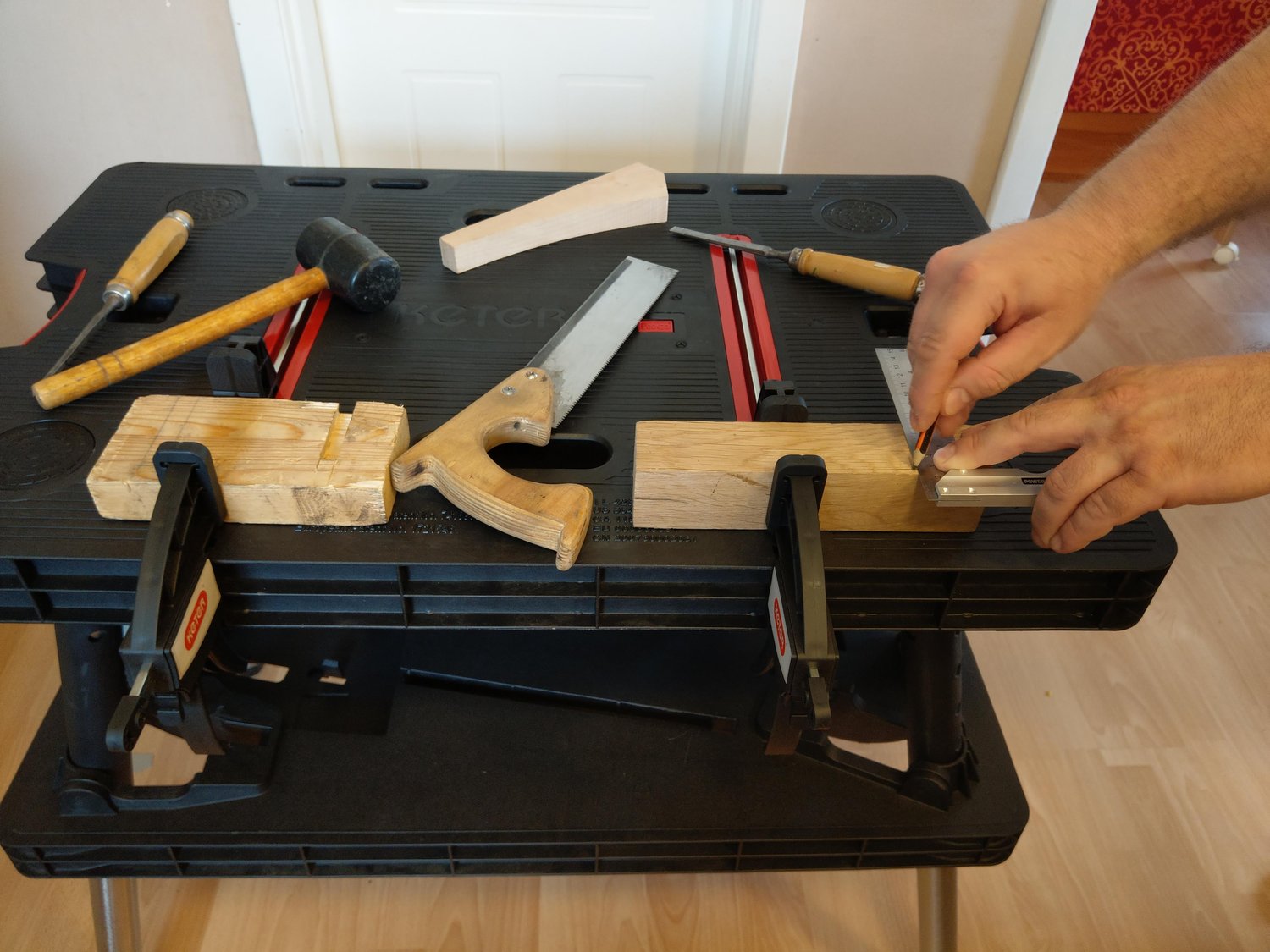 A próba alatt véstem, fúrtam, fűrészeltem, ragasztottam és felületet is kezeltem. Az elmondható, hogy minden egyes munkafolyamatnál élveztem a munkát. A munkaasztal stabilitására, méretére nem lehetett panasz. Ráadásul, amikor befejeztem a munkát egy mozdulattal, nyilván a lepakolás után egyszerűen össze lehetett csukni és el lehetett tenni, akár egy félreeső sarokba a falhoz támasztva, akár az ágy alá, vagy a fészerbe.