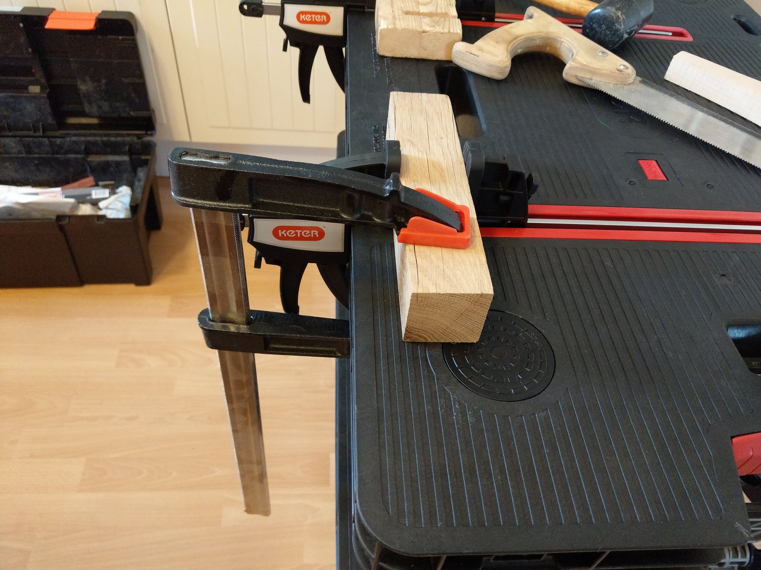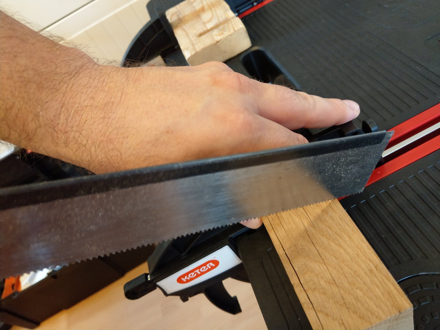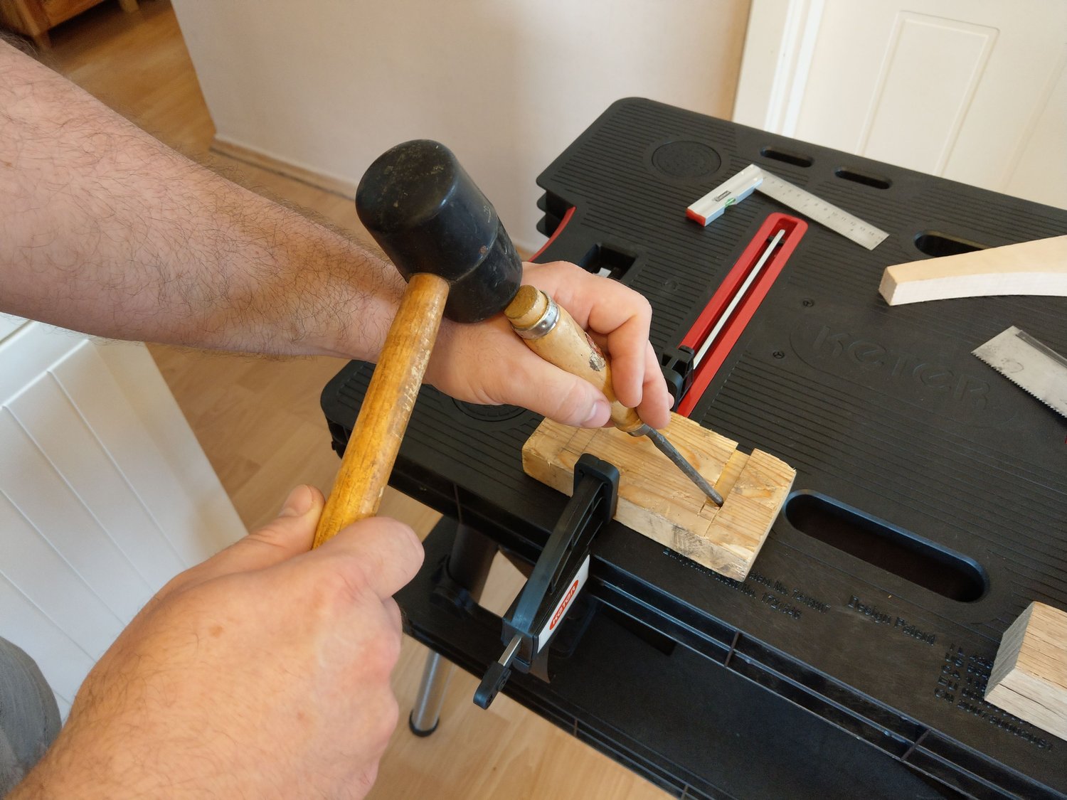 A próba alatt véstem, fúrtam, fűrészeltem, ragasztottam és felületet is kezeltem. Az elmondható, hogy minden egyes munkafolyamatnál élveztem a munkát. A munkaasztal stabilitására, méretére nem lehetett panasz. Ráadásul, amikor befejeztem a munkát egy mozdulattal, nyilván a lepakolás után egyszerűen össze lehetett csukni és el lehetett tenni, akár egy félreeső sarokba a falhoz támasztva, akár az ágy alá, vagy a fészerbe.