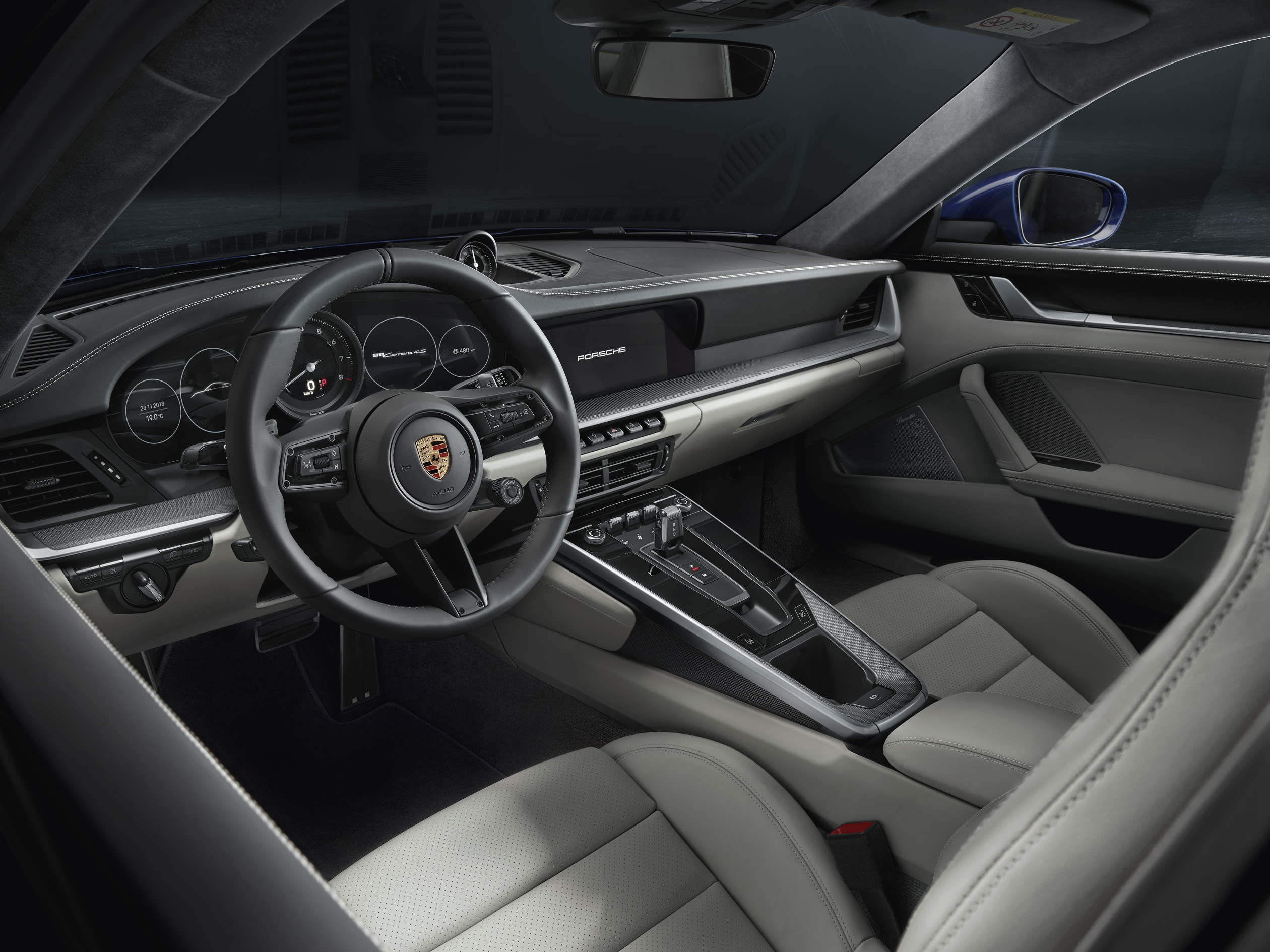 A teljesen megújult belső teret a műszerfal egyértelmű egyenes vonalai határozzák meg, amelyhez az inspirációt a 70-es évek 911 modelljei jelentették. A Porsche-tipikus központi fordulatszámmérő mellett két vékony, keret nélküli kijelző látja el a vezetőt információval. A PCM központi kijelzője immár 10,9 colos, új elrendezésének köszönhetően pedig gyorsan és figyelemelterelés nélkül működtethető. Ez alatt található egy kompakt kapcsolópanel, amelynek öt gombja közvetlen hozzáférést biztosít a jármű legfontosabb funkcióihoz. Digitalizáció tekintetében az új 911 egyértelmű lépést tesz a jövő irányába átfogó kapcsolódási lehetőségeivel, új funkcióival és modern szolgáltatásaival. A széria PCM raj-intelligencián alapuló online navigációt és Porsche Connect Plus modult is tartalmaz.