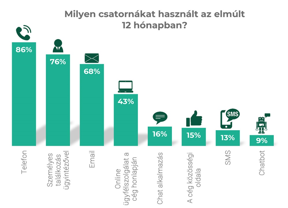 Ha ügyintézésről van szó, a magyar ügyfél első számú választása természetesen a telefon, amely magasan vezeti az egészen a chatbotig terjedő ügyfélkapcsolati rangsort. A lista a személyes ügyintézéssel, az emaillel majd az online ügyfélszolgálattal folytatódik, és ezzel a mezőny egyértelműen két részre szakad. A további online és digitális csatornák jelentős lemaradásban vannak, a sort a chatbot zárja, melyről a válaszadók csaknem fele nem is tudja, mire való.