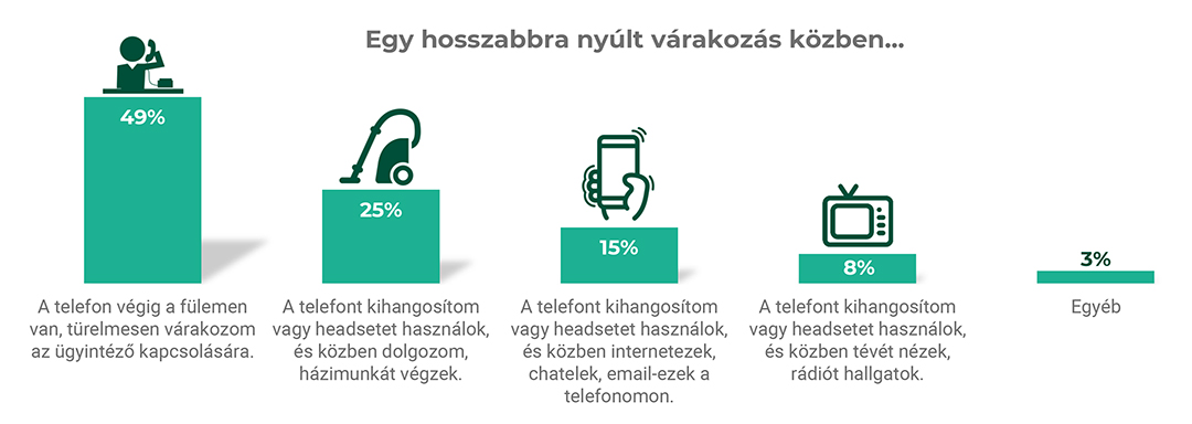 Bár még mindig a telefon a legnépszerűbb ügyfélkommunikációs csatorna, a viszonyunk vele nem teljesen problémamentes. A legtöbben arra panaszkodnak, hogy az okos menü nem elég okos, és túl sokáig tart, míg a megfelelő ügyintézőhöz kerülnek (67%). A türelmetlenebbek (ötből négyen) pillanatok alatt le is csapják a készüléket, ha nem kapnak gyorsan segítséget. Sokan kreatív várakozási stratégiákat dolgoznak ki, és amíg zajlik az ügyintézés, headsettel a fülükön kitakarítják a lakást (25%), chatelnek és neteznek (15%) vagy éppen tévéznek egy kicsit (8%).
