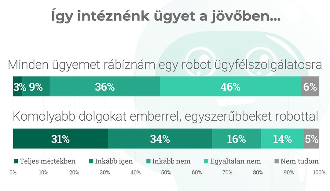 34 százalék egyetértett azzal, hogy egy robot ügyfélszolgálatos gyorsabban fog a dolgok végére járni, mint egy valódi, de azt már csak 12 százalékuk erősítette meg, hogy minden ügyét nyugodt szívvel rá is bízná. Az emberi hangot és a gépi gyorsaságot vegyítő kommunikációra már nyitottabb a közönség: a válaszadók kétharmada az egyszerűbb ügyeket szívesen intézné robottal, de szeretné, ha lehetősége lenne valódi ügyfélszolgálatossal is beszélni, ha komolyabb dologról van szó.