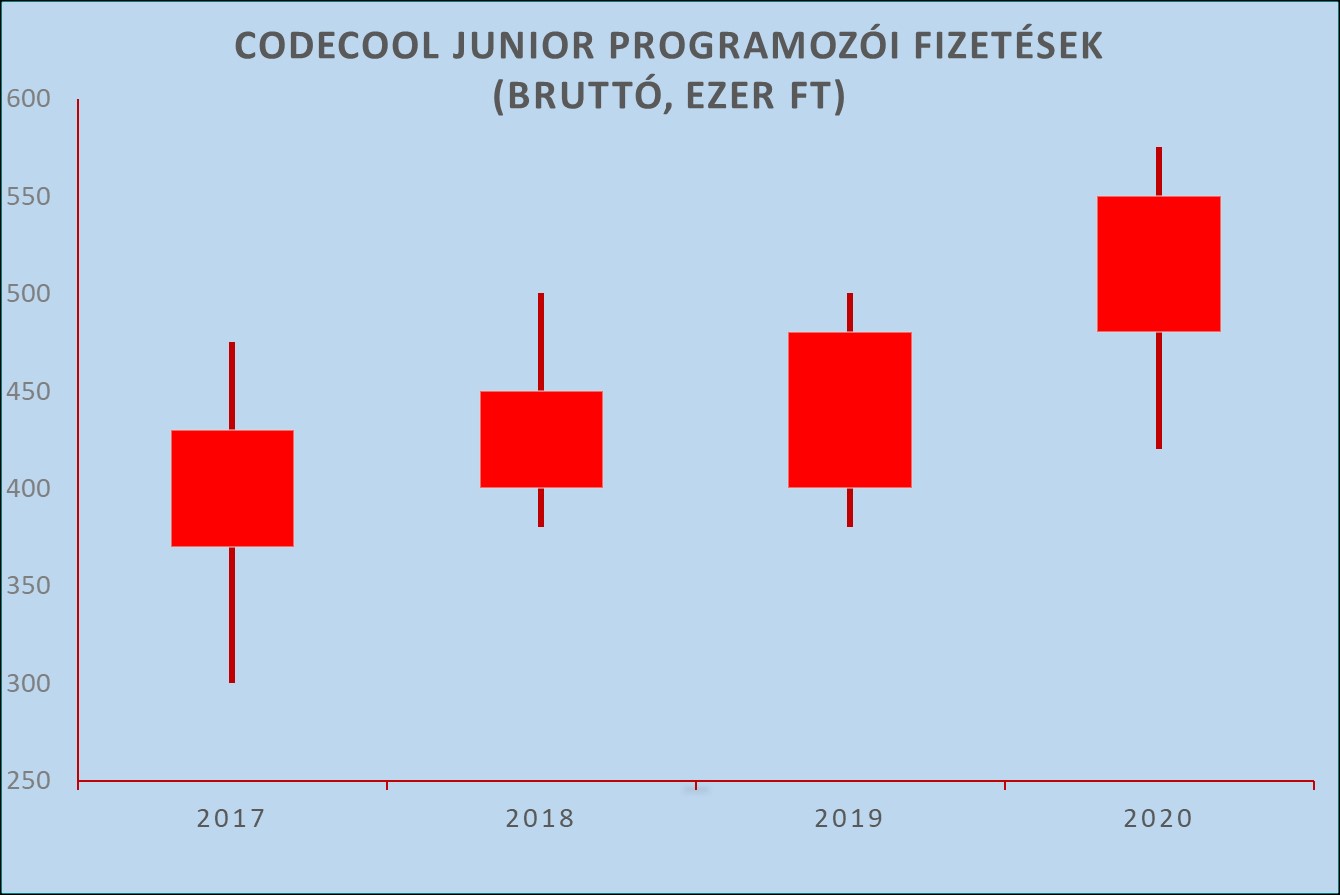 Időről időre összesíti a Codecool Programozóiskola, hogy a kurzusait elvégző tanulói milyen kezdő bérrel kapnak munkát a gyakornoki időszak után. Nemrégiben helyezték állásba Budapesten az 500. tanulójukat, és mivel legtöbben igénybe veszik a kínált állásgaranciát jelentkezéskor, ezért a Codecoolnak teljes rálátása van arra, hogy milyen bruttó bérszinten „kelnek el” az – elsősorban a 22-40 év közötti korosztályból kikerülő – diákok.