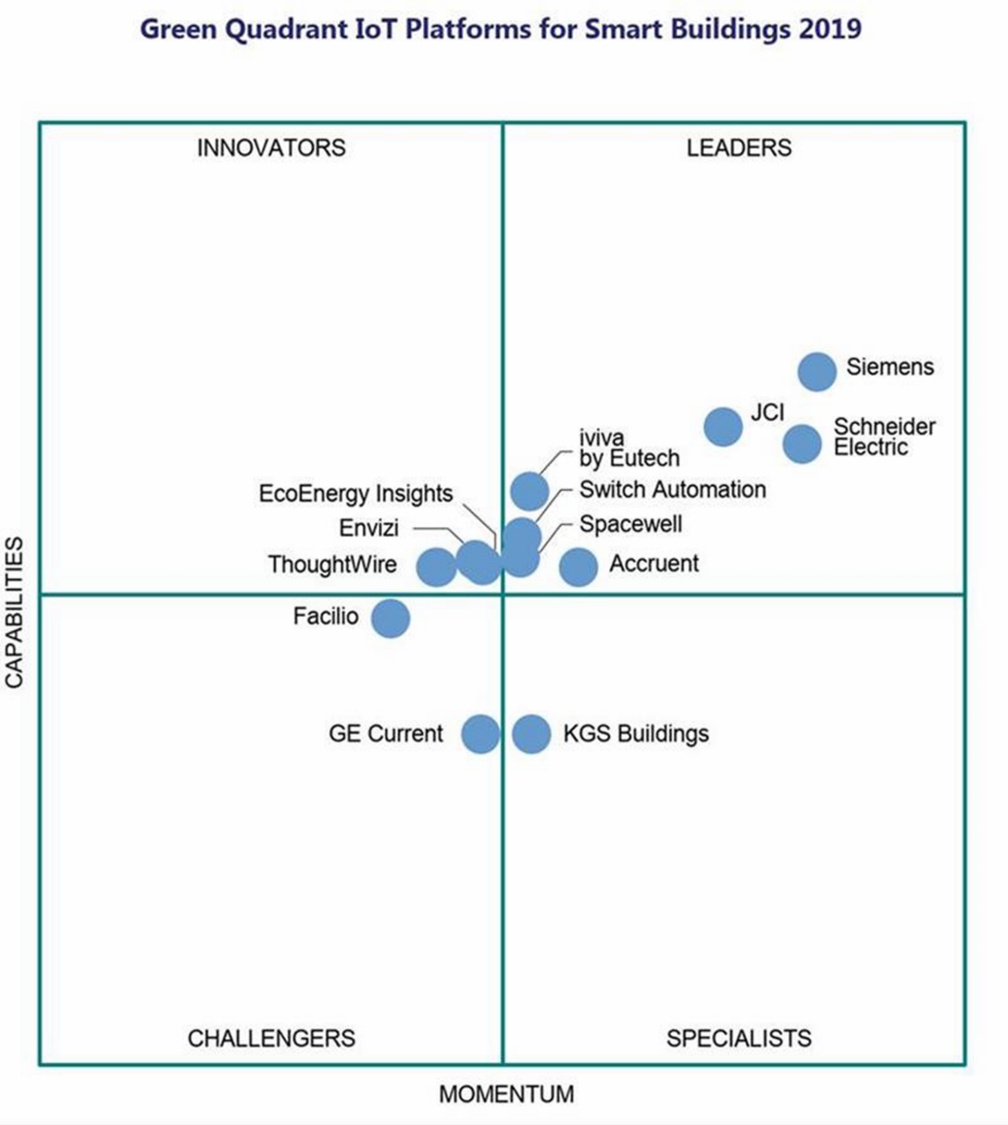 A Verdantix független ipari kutatóintézet az okos épületek terén a Dolgok Internete (IoT) platformok vezető szolgáltatójaként rangsorolta a Siemenst. A Verdantix a „Green Quadrant IoT platforms for Smart Buildings 2019” jelentésben 13 olyan vállalatot értékelt, melyek a megítélésük szerint a még gyerekcipőben járó, de már erős versenyt felmutató piacot formálják.
