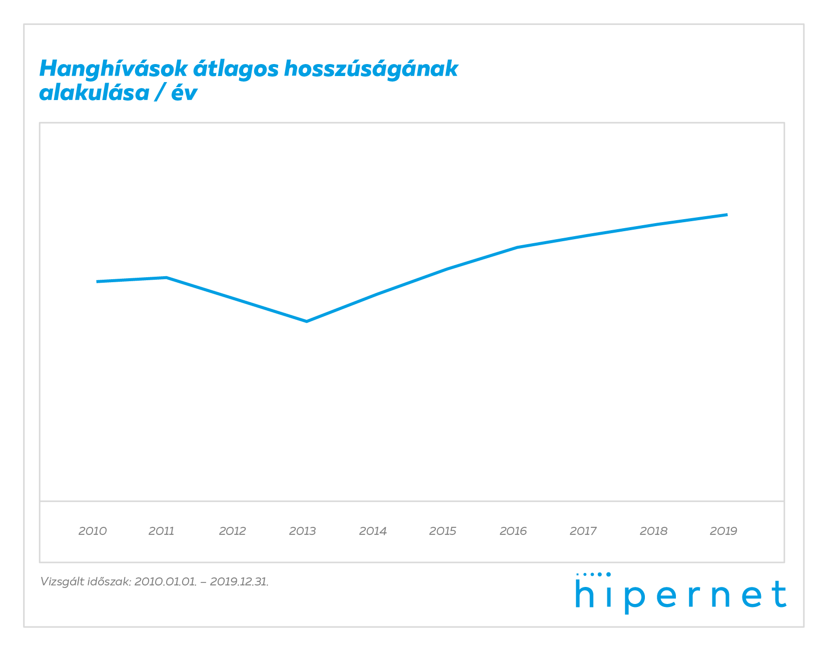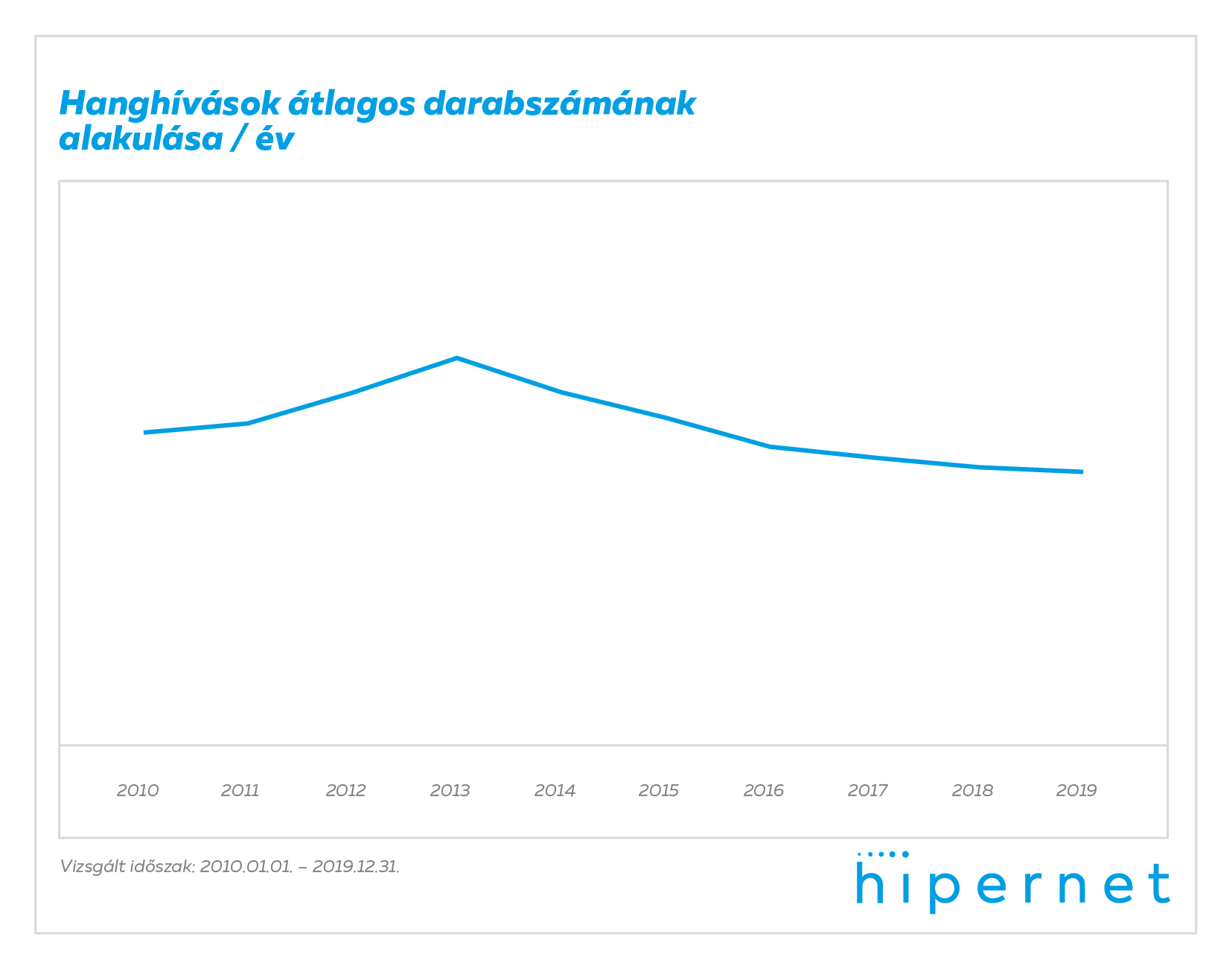 A csevegőalkalmazások üzenetküldés mellett hanghívásra is alkalmasak, ennek ellenére a Telenor ügyfelei az elmúlt 10 évben nem cserélték le a jól bevált hangszolgáltatást az online szolgáltatásokra. De hogyan alakult a hanghívások népszerűsége? Az indított mobilhívások havi átlagos darabszáma 2013-ban érte el a maximumát, és azóta csökkenő tendenciát mutat. Ez a trend azonban nem jelenti azt, hogy kevesebbet beszélnénk: a hívások átlagos hosszát megvizsgálva látszik, hogy a 2013-as darabszám-csúcson a hívások hossza jóval alacsonyabb volt a környező évekhez képest, azaz ebben az időszakban a Telenor ügyfelei gyakrabban telefonáltak, de rövidebb hívásokat bonyolítottak. A hívások darabszámának csökkenése mellett a hívások átlagos hossza növekszik, ami összességében a hangforgalom növekvő tendenciáját eredményezi.