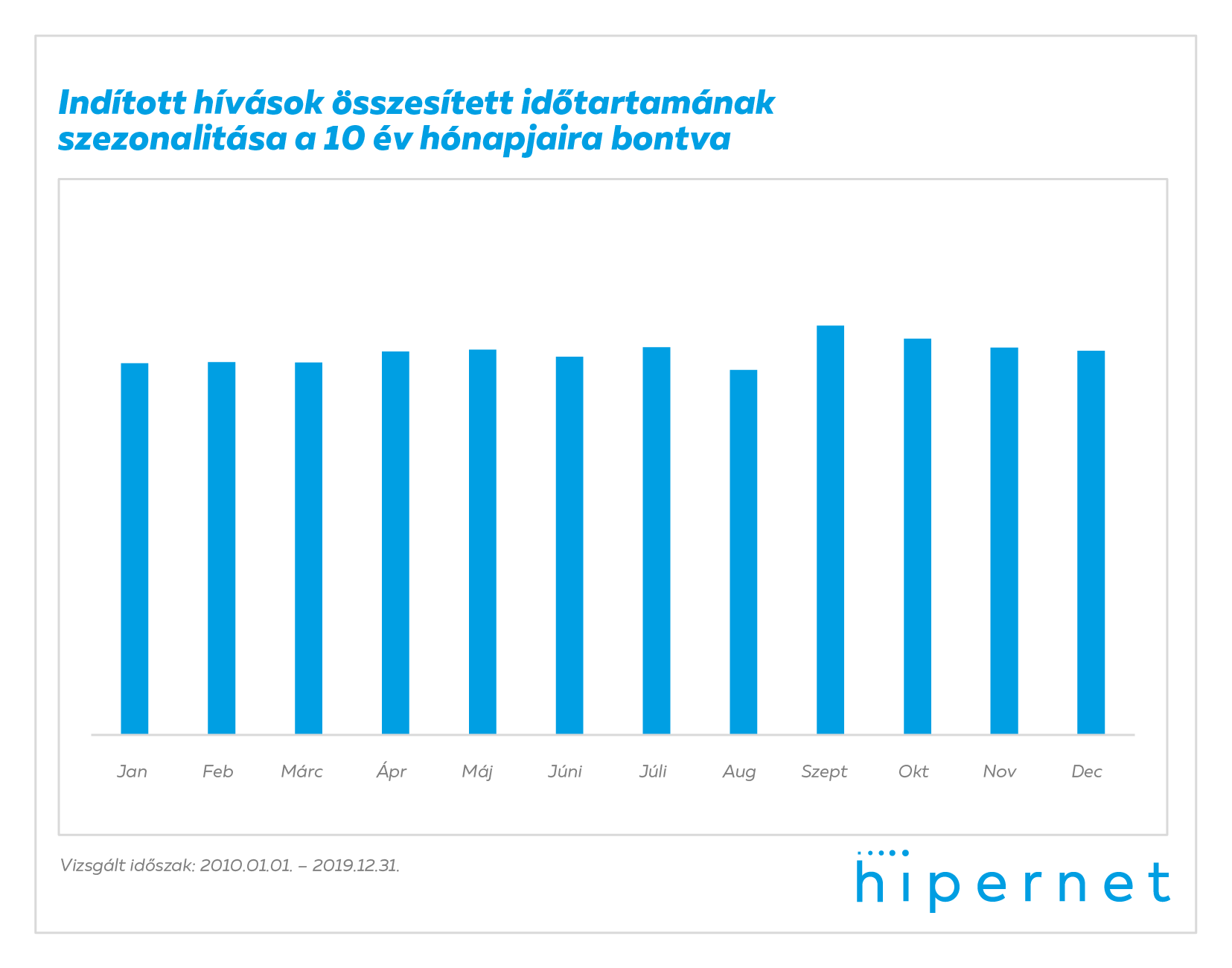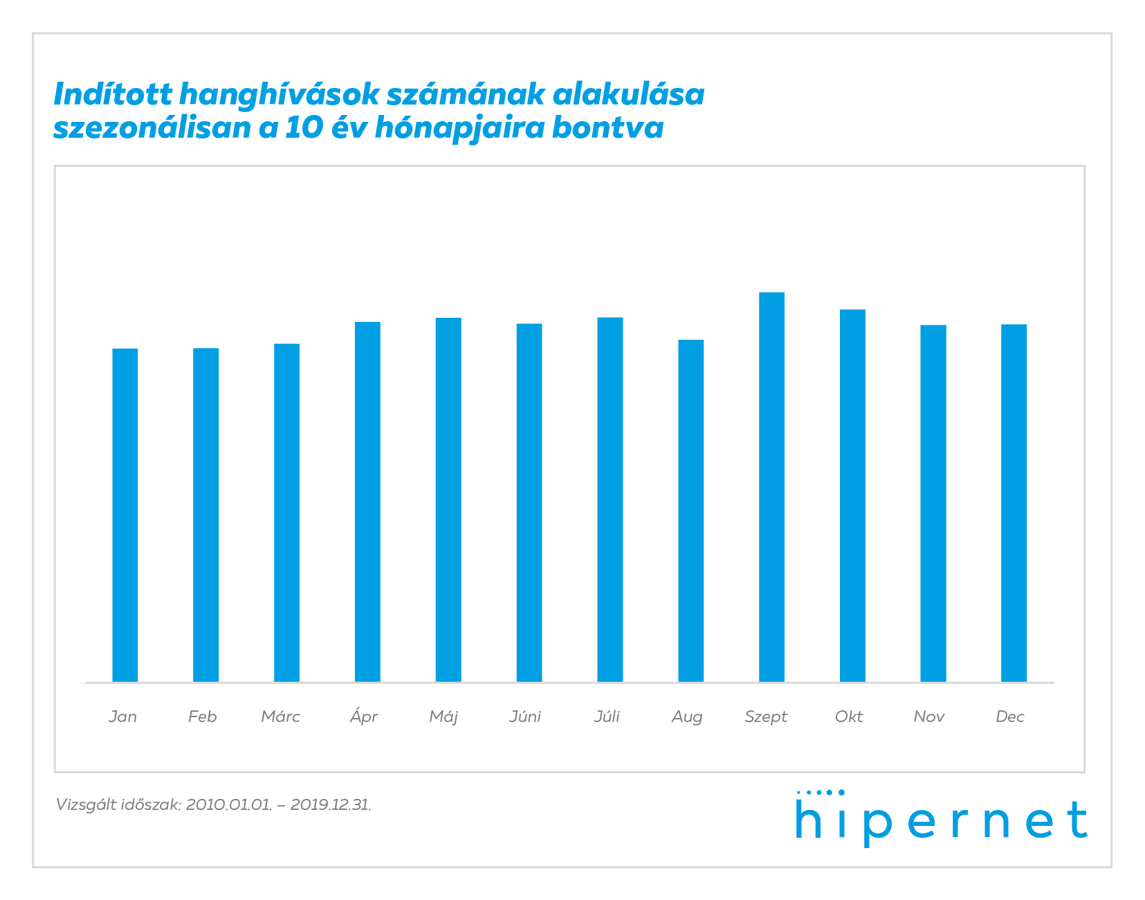 A hanghívásokat vizsgálva látszik, hogy szezonálisan a legtöbb hívást szeptemberben indítják a Telenor ügyfelei. A nyaralásról visszatérés, az iskolaszezon kezdete mind közrejátszhat a szeptemberben növekvő adatokhoz. Ez a hónap nem csak az indított hívások darabszámának nyertese a 10 év adatait tartalmazó elemzésben: az indított hanghívások átlagos hossza is ebben a hónapban a legnagyobb az év során.