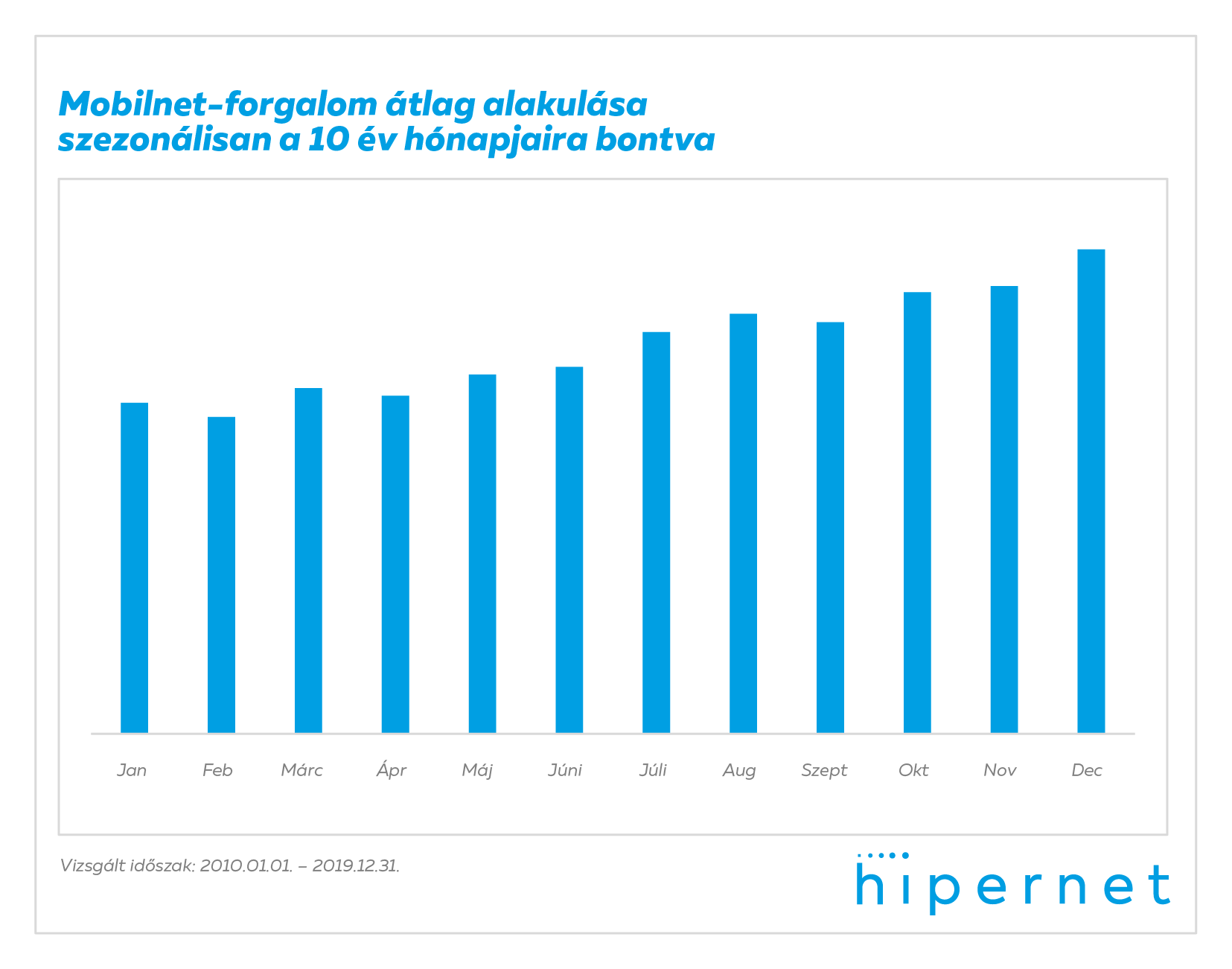 Mobilnet terén némiképp eltérő tendencia érvényesült, és a 10 év decembereinek összesített átlaga lett a nyerő. Ennek hátterében az áll, hogy 10 éven át szinte minden éven belül folyamatosan nőtt a mobilnetes forgalom, ami 10 egyre erősebb januárt, februárt és így folytatva egyre erősebb decembert jelent.