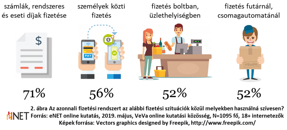 A netezők a legnagyobb arányban számlák, rendszeres és eseti díjak fizetésére (71 százalék) használnák az azonnali fizetési rendszert, de a személyek közti (56 százalék); a boltban, üzlethelyiségben, illetve a futárnál, csomagautomatánál történő fizetésre (egyaránt 52 százalék) is nyitottak.