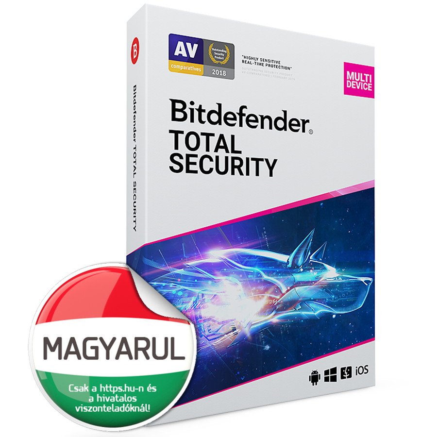 A Bitdefender Total Security egy háztartásban 5 eszközön (PC, notebook, tablet vagy telefon), magyar nyelven 1 évig használható. A vírusvédelmen és személyi tűzfalon kívül a fejlett fenyegetések, a banki adatok megszerzése és jelszólopások ellen is védelmet nyújt, a számítógép titkosítását és a sérülékeny