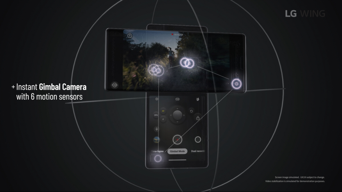 A mobiltelefonban a világon elsőként bemutatott Gimbal Motion Camera az eszköz másodlagos képernyőjét kényelmes fogantyúként hasznosítja. Ez stabilitást biztosít a fotózáshoz és videózáshoz, azaz a felhasználók egykezes használattal is rázkódásmentes videófelvételeket készíthetnek. Az LG WING olyan funkciókat kínál, amik jellemzően csak az igazi gimbal kamerastabilizátorokban léteznek: joystick a kamera dőlésszögének szabályozásához, retesz a rázkódások és elmosódások csökkentéséhez, követési mód, pásztázó-követő mód, valamint első személy (first person) mód a dinamikus és ritmikus mozgások rögzítéséhez.