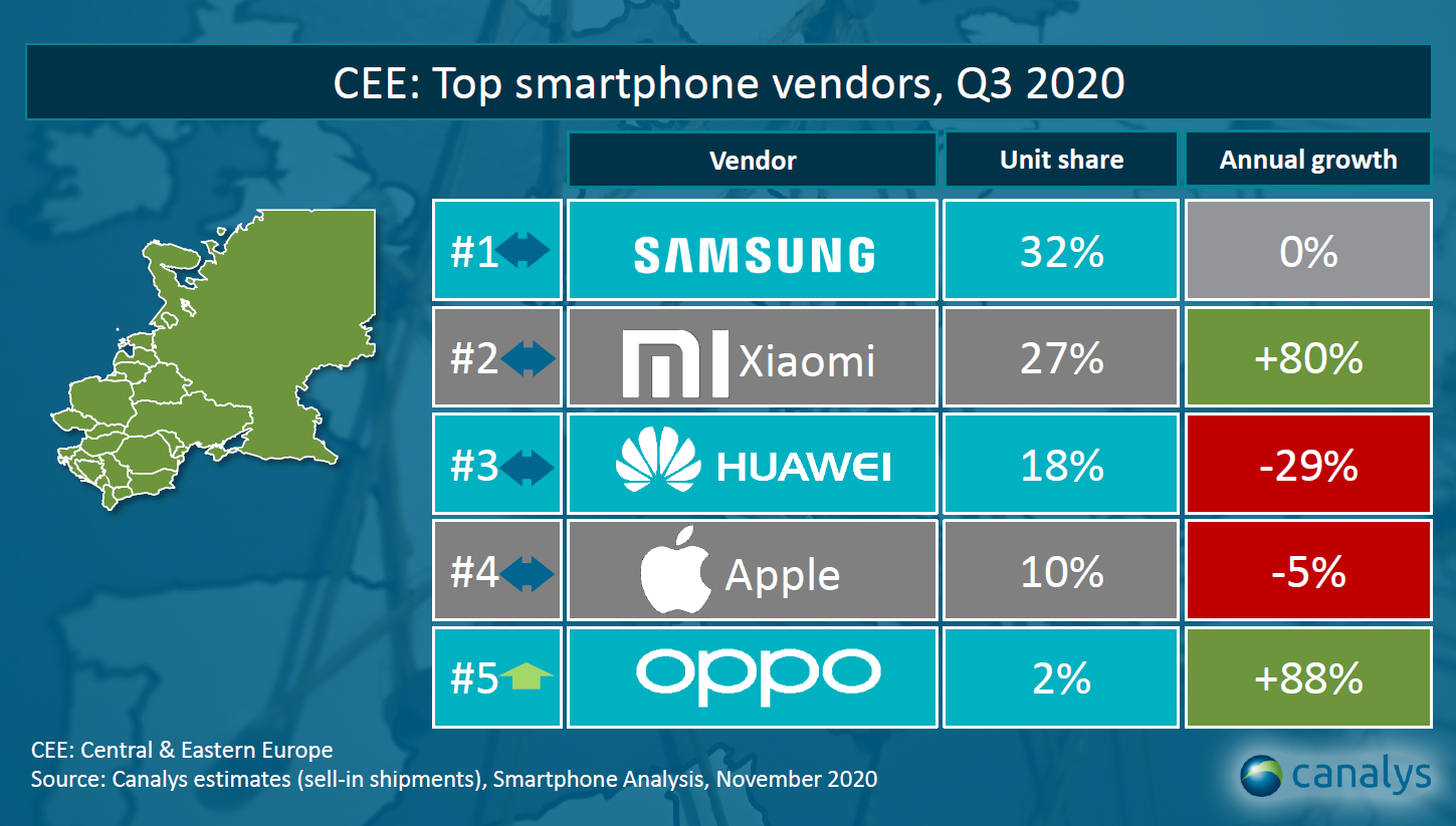 A világ egyik vezető techcége, a Xiaomi, 2020. harmadik negyedévében Közép-és Kelet-Európa második legnagyobb okostelefon-gyártójává lépett elő a Canalys globális piackutató cég jelentése szerint. A vállalat éves szinten 80 százalékpontos növekedéssel 27 százalékos piaci részesedést szerzett a régióban, Európában pedig 91százalékpontot bővülve 19 százalékos piaci részesedést ért el, amellyel ugyanebben az időszakban továbbra is őrzi az európai harmadik helyezést.