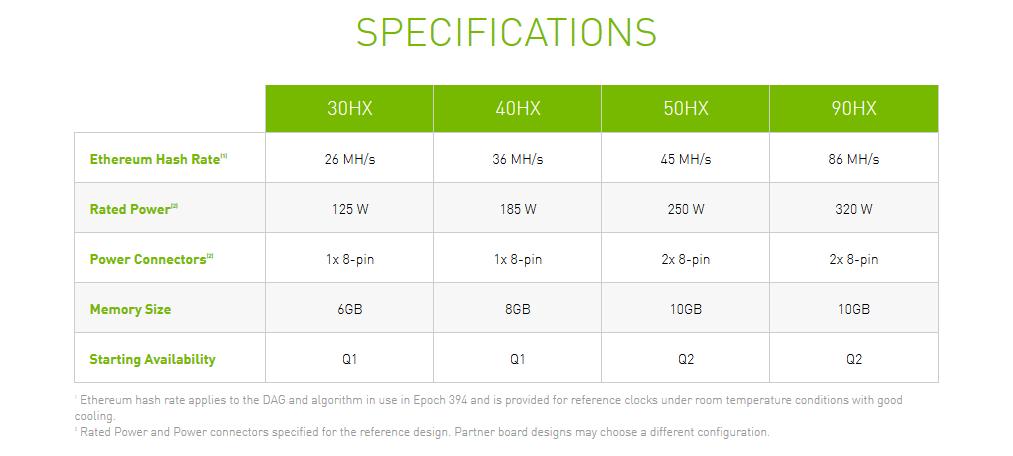 saját memóriával ami 26 MH/s teljesítményre lesz majd képes Ethereum bányászat során.A CMP sorozatban a jelenlegi kínálat mellett a 90HX fogja képviselni a csúcsot 320W-os fogyasztással, 86 MH/s teljesítményt kínálva a crypto bányászoknak ami várhatóan a második negyedév során jelenik majd meg. Eközben a cég igyekszik a hagyományos grafikus kártyák driver csomagjában 50%-al korlátozni a hash teljesítményt, így terelve a bányászokat az új kártyákra. Azonban az nVidia driver korlátozása igencsak kétséges lépés, mivel a
