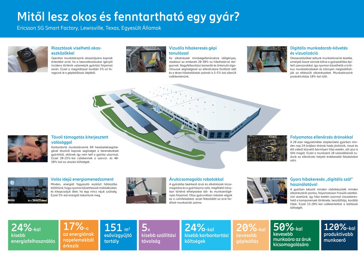 A hálózati eszközöket gyártó Ericsson USA 5G Smart Factory dolgozói 25 úttörő technológia alkalmazásával 120 százalékkal nagyobb kibocsátásra képesek, mintha egy hagyományos üzemben dolgoznának – és mindemellett a gyártás ökológiai lábnyoma is sokkal kisebb. Az Ericsson nemcsak saját gyárában alkalmazza ezeket a megoldásokat, hanem ipari ügyfelei számára is értékesíti.