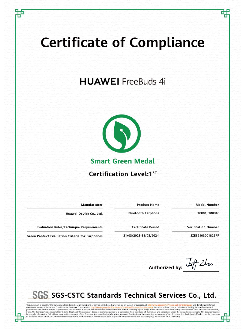 Hogy megszerezze az SGS tanúsítványát, a Huawei számos kritériumnak eleget tett: a termék életciklusának minden szakaszában minimalizálta a FreeBuds 4i környezetre gyakorolt hatását. A tervezésénél energiatakarékos alkatrészeket és szoftvereket használtak, a műanyag elemek bio-alapú anyagokat tartalmaznak, és mind a csomagolást, mind a használati útmutatót szójafestékkel nyomtatták. Bizonyos veszélyes anyagok használatát jelentősen csökkentették az újrahasznosíthatóság maximalizálása érdekében. Az akkumulátort különféle esetekben, például extrém hőmérsékleti vagy nyomáskörülmények között tesztelték.