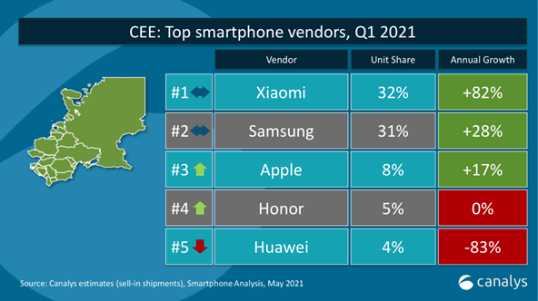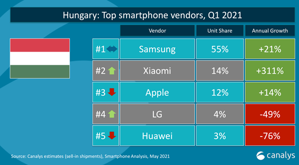 Magyarországon a Xiaomi érte el messze a legnagyobb éven belüli növekedést a mobilgyártók között 2021 első negyedévében, 311 százalékot, és ezzel a második legnagyobb szereplő lett az okostelefonok piacán.