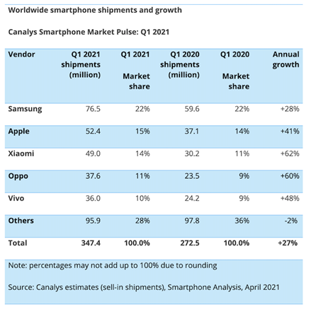 A Canalys Smartphone Market Pulse: Q1 2021 tanulmány szerint a Xiaomi a legutóbbi negyedévben érte el története legjobb eredményét: 62 százalékkal növekedtek az eladásai, 49 millió készüléket szállított le a partnereinek. A világ öt legnagyobb okostelefon brand-je közül, a leszállított készülékek tekintetében, 2021 első negyedévében a Xiaomi növekedett a legerőteljesebben az előző évi adatokhoz képest.