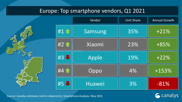 A Canalys okostelefon eladásokra vonatkozó idei első negyedéves adatai szerint a Xiaomi Európában – most először – a második helyre került.