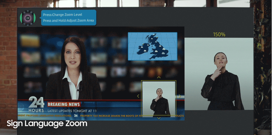 A siketek által használt jelnyelv a szavak jelentését kézjelek- és mozdulatok segítségével fejezi ki. Egyes jelek azonban többféle jelentéssel bírhatnak különböző helyzetekben, amely az arckifejezésről vagy a szájról olvasható le. A Samsung tévék a vállalat saját MI algoritmusának köszönhetően automatikusan felismerik a jelelést és a kép megfelelő részét kétszeresére nagyítják, hogy a részletek jobban láthatók legyenek. A felhasználók maguk is kiválaszthatják a nagyítandó területet a képernyőn és beállíthatják a nagyítás mértékét, hogy közelebbről láthassanak olyan fontos információkat, mint például egy kvíz kérdései vagy egy sportesemény eredményjelzője.