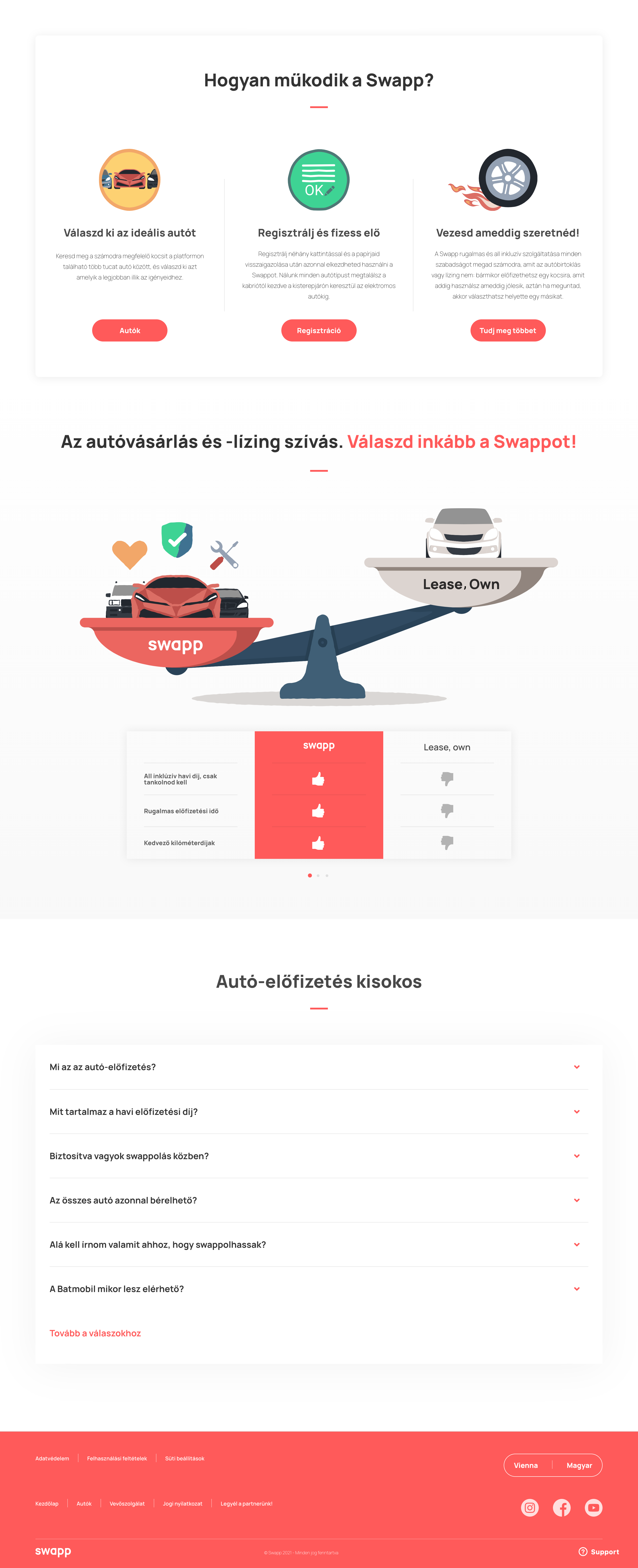 A Swapp platformon elérhető minden autó casco biztosítással és asszisztencia szolgáltatással rendelkezik, így az előfizetőt nem érhetik meglepetések. A felhasználó a casco önrész, vagyis 10 százalék erejéig viseli a felelősséget káresemény esetén. Ha az autó szervizelésre szorul, akkor is a Swapp ügyfélszolgálata intézi a teendőket a flottapartnerek bevonásával. A havidíj az autó használati díján túl tartalmazza a szervizelés, a biztosítás, az asszisztencia és a budapesti házhozszállítás költségét, illetve egy meghatározott futáskilométert. Ha egy felhasználó többet autózik egy hónapban, mint a havidíjban meghatározott távolság, akkor extra kilométereket vásárolhat. A flottapartnerek az előfizetési díjról a magyar adószabályoknak megfelelő számlát állítanak ki a Swapp rendszerén keresztül.