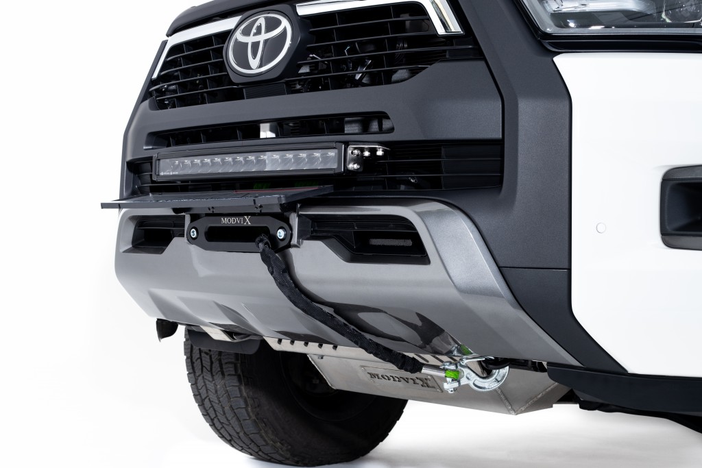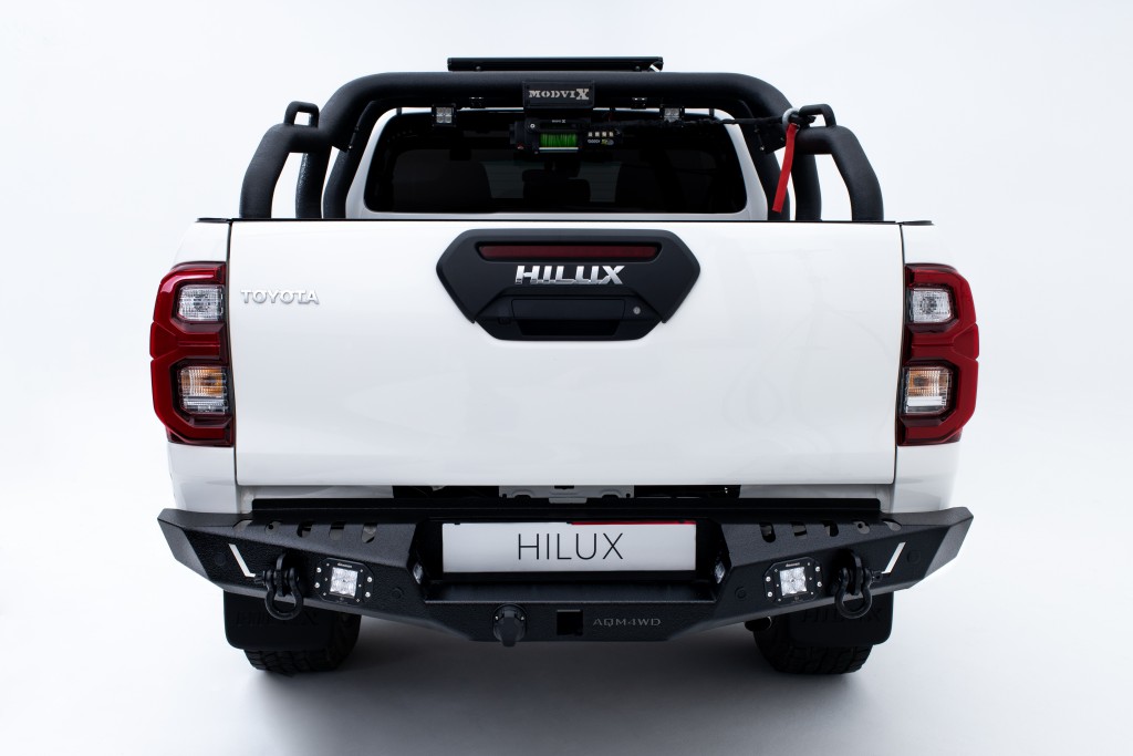 Modvix hátsó lökhárító: 2 db 20W tolatást segítő munkalámpával, 2 db vontató seklivel, 2 db rendszámtábla világítással és vonóhorog kialakítással.