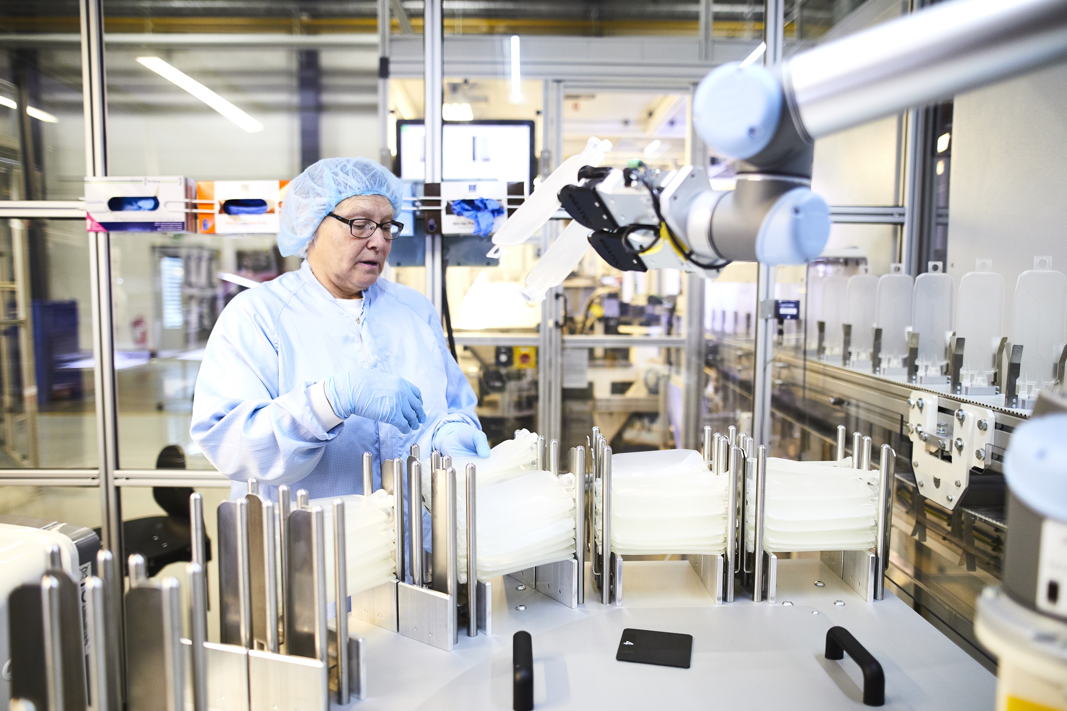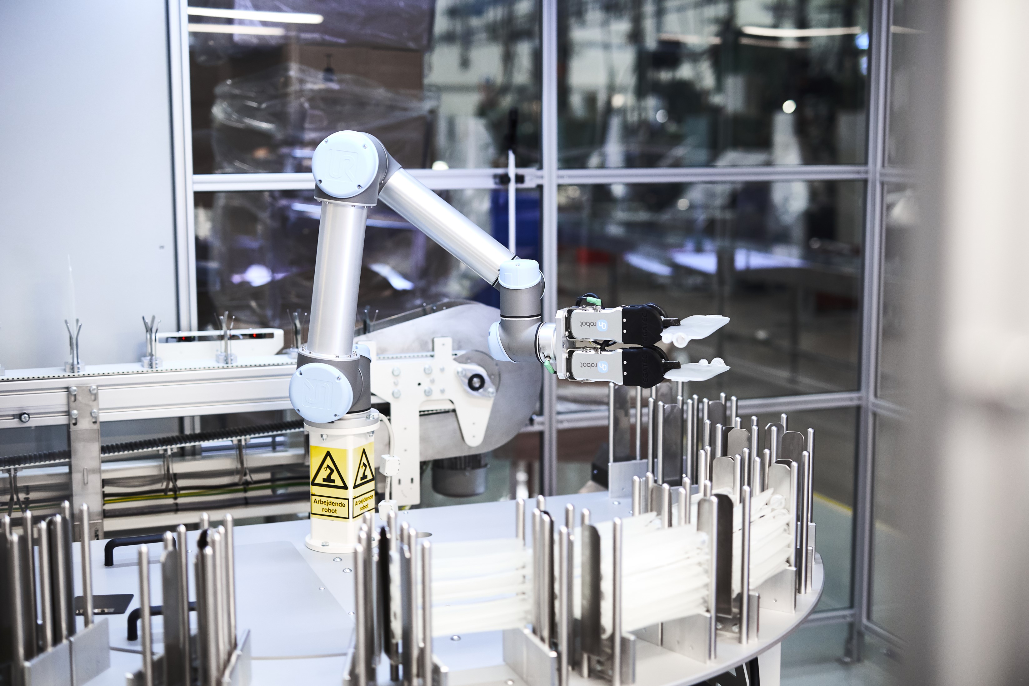 A dániai Langeskovban infúziós tartályokat gyártó MedicoPack is a kobotokhoz fordult, ezen a területen a szennyeződések veszélyének csökkentése a legfontosabb tényező. A gyártást évtizedek óta a kockázatok minimalizálásának szem előtt tartásával fejlesztették, de a végső szakaszban az elkészült termékek klinikailag tiszta robotok által automatizált egymásra rakodása még tovább emeli a biztonságot, miközben ezalatt az alkalmazottak más, kreatívabb feladatokkal foglalkozhatnak.