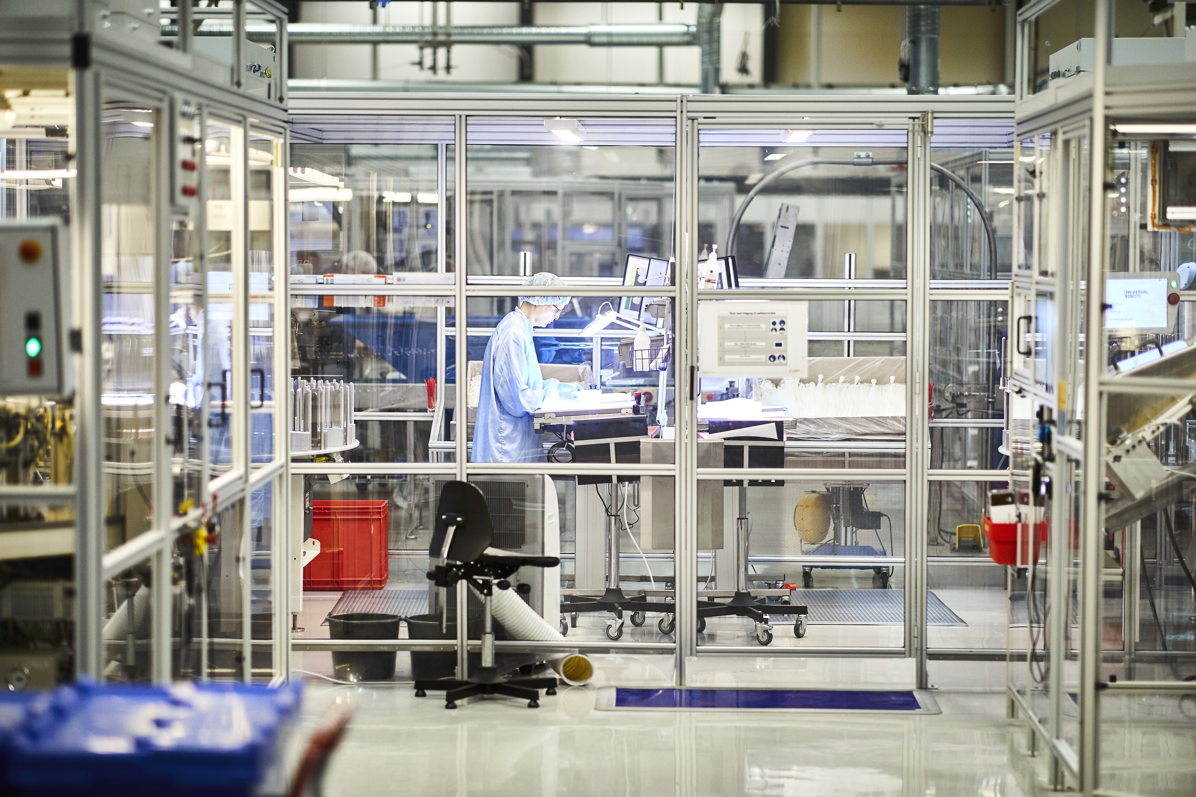 Mivel a robotokat először a gyártóiparban kezdték el használni, érthető, hogy gyakrabban találkozhatunk velük az egészségügyi felszerelések gyártása kapcsán. A különféle példák között említhetjük az orvosi üvegek töltőállomásait vagy teljesen automatizált fecskendő-összeállító gyártósorokat, amelyek nagy mennyiségben termelnek, akár a nap 24 órájában, anélkül, hogy az alkalmazottaknak védőfelszerelést kellene viselniük, illetve különböző védőruházatot cserélniük a nap folyamán.