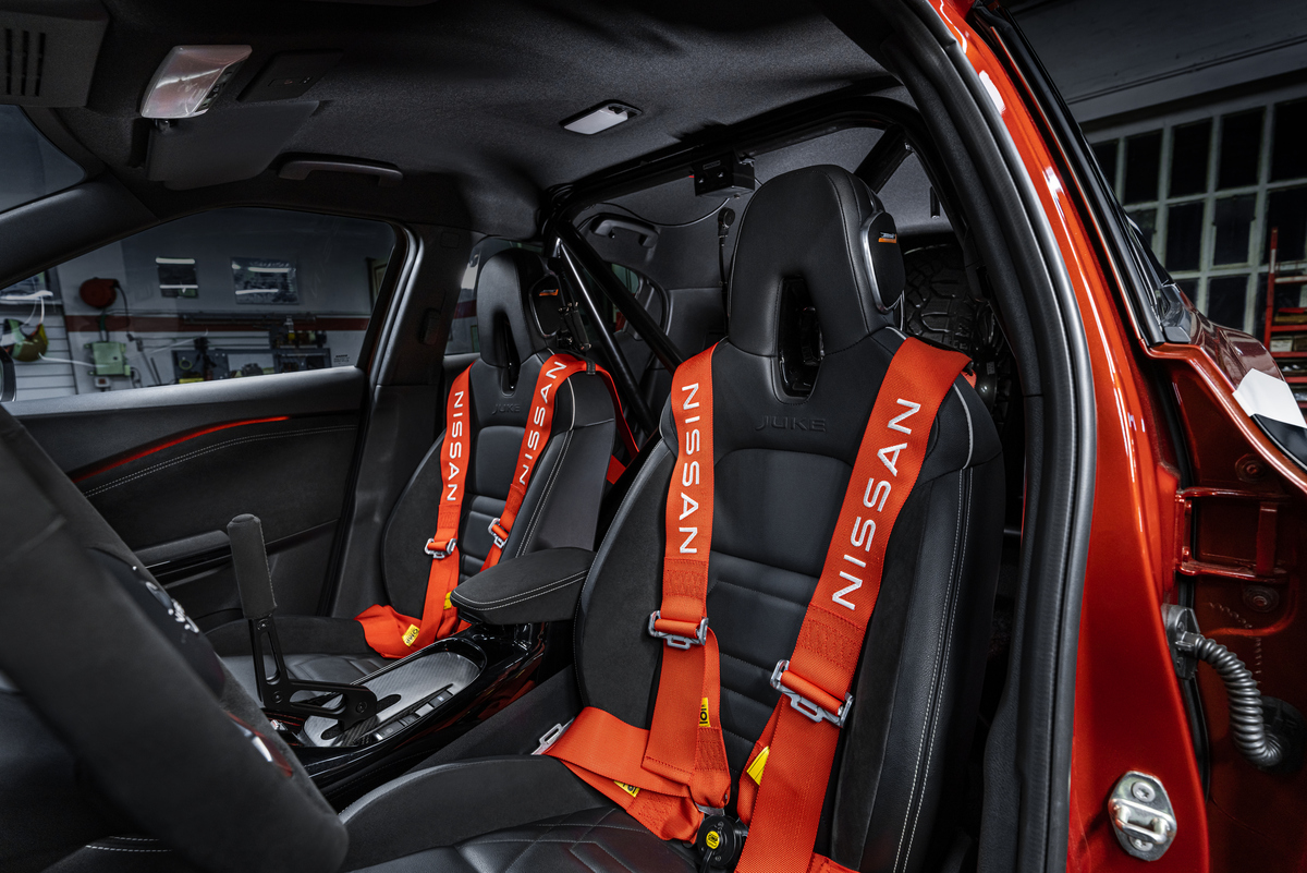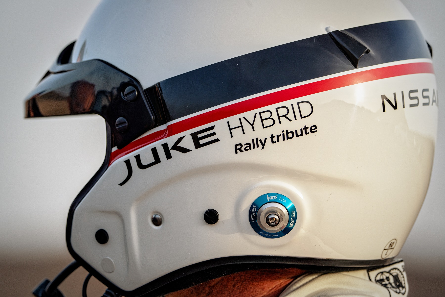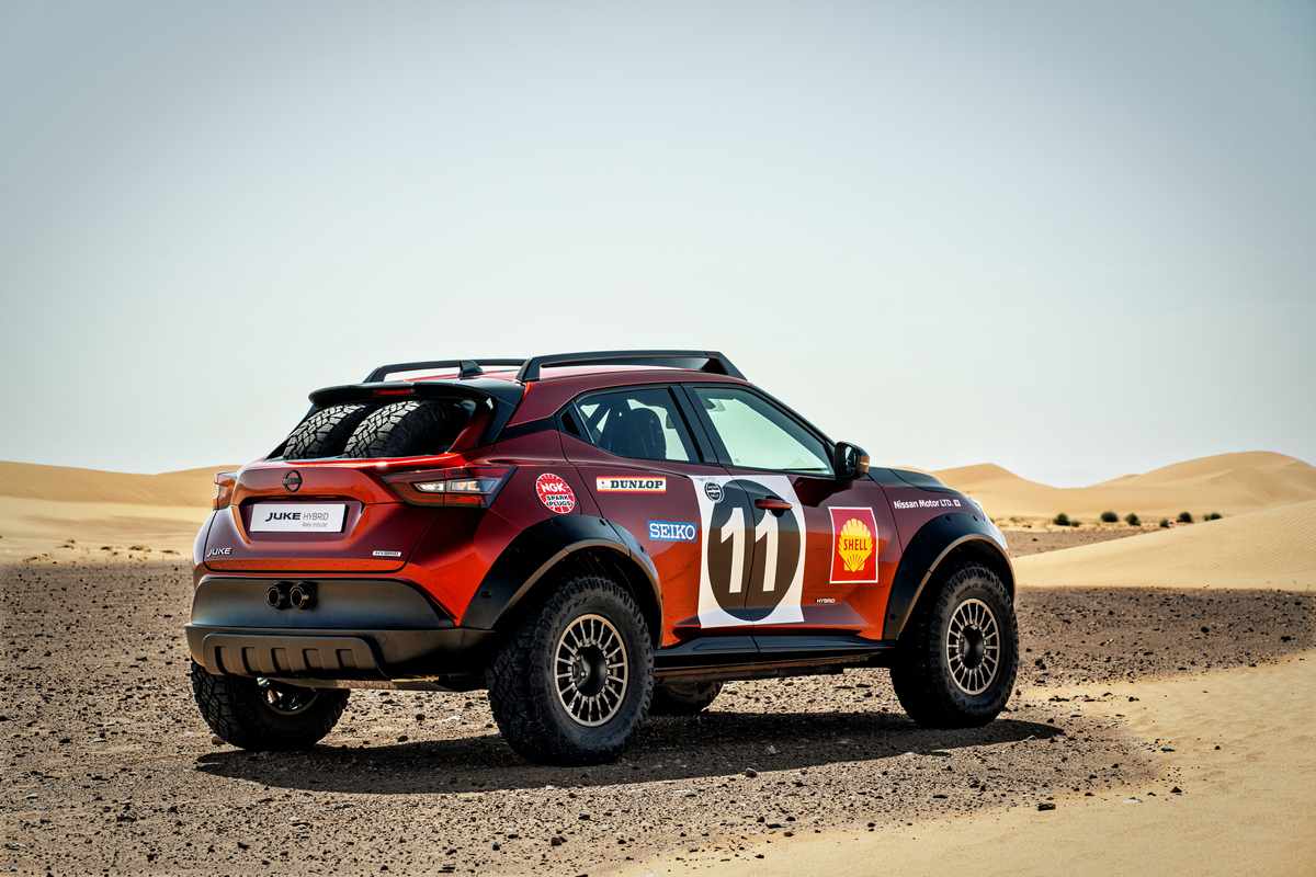 Hasonlóképpen, a fekete motorháztető és a megnövelt fekete kerekek vizuálisan is tisztelegnek az 1971-es jármű előtt, amely a Kelet-Afrikai rally-n indult. A régi szponzorok logóinak és a 11-es számnak a használata szintén a 240Z rally autót tükrözi, akárcsak a megerősített lemezek az első és hátsó küszöbök alatt, amelyek védelmet nyújtanak a jármű aljának. A Juke Hybrid Rally Tribute megerősített és hosszú rúgóúttal ellátott felfüggesztést kapott, hogy a Juke Hybrid Rally Tribute kivételes kiegyensúlyozottságot nyújtson a kihívásokkal teli terepen. A 265/70 R16 méretű gumiabroncsok erőteljes tapadást minden körülmények között. A belső teret egy csővázas rendszerrel merevítették, amely védelmet nyújt a kihívást jelentő sivatagi környezetben egy esetleges baleset esetén. A hátsó üléseket eltávolították, hogy helyet biztosítsanak a pótkeréknek, és négypontos biztonsági öveket építettek be, hogy a vezető és a navigátor biztonságosan rögzüljön a versenyülésekben.